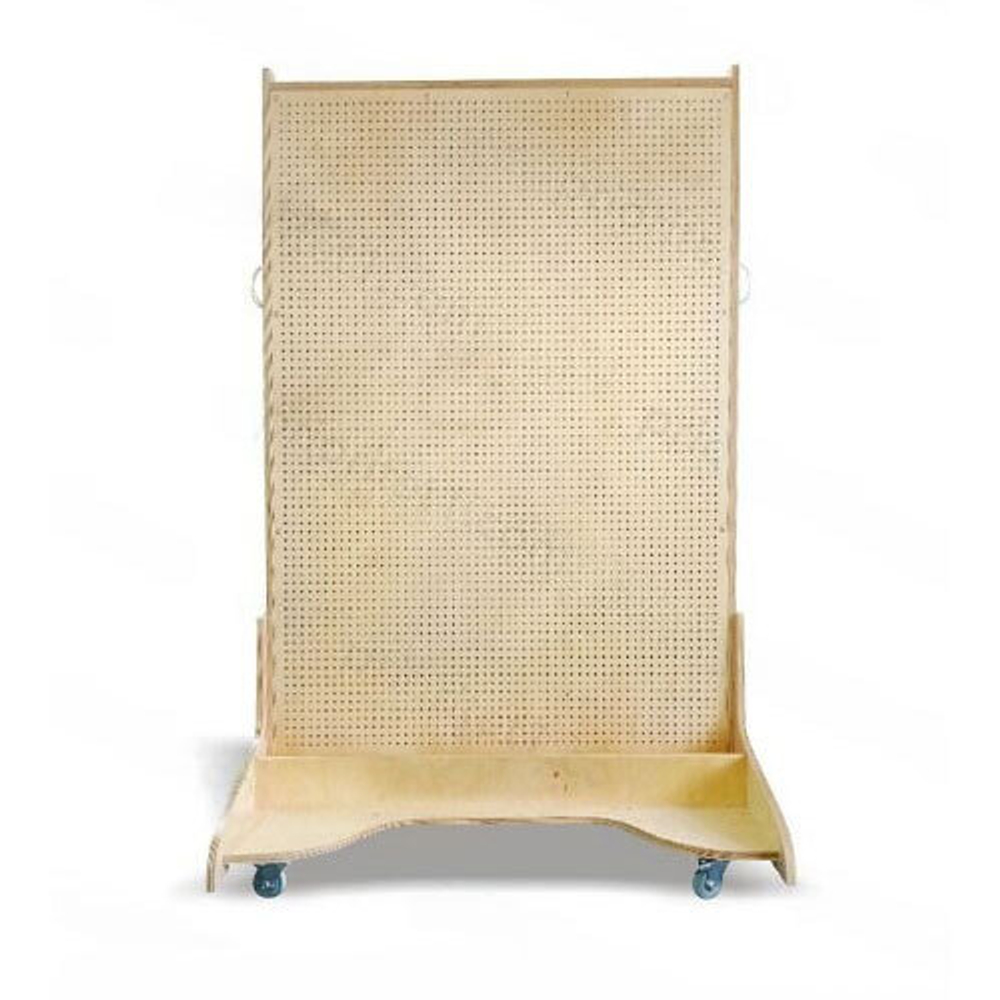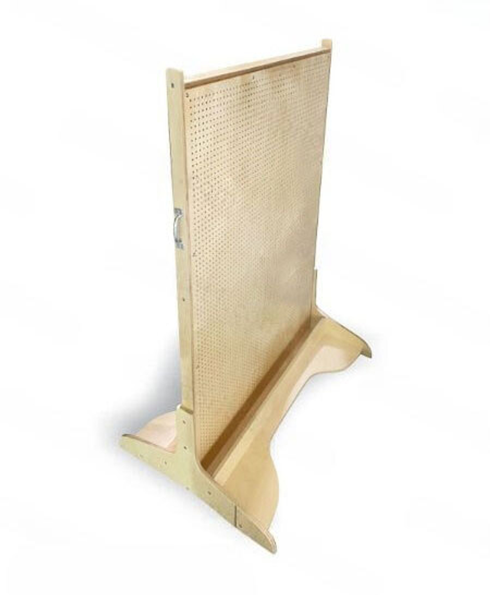 Вертикальная мобильная тактильно-развивающая панель, установленная на основании с 4 подвижными, вращающимися вокруг своей оси колесами. Система Stem Wall выполненная из березовой фанеры, в которой имеются специальные отверстия, предназначенные для фиксации на ней тех или иных образовательных комплексов системы Stem.