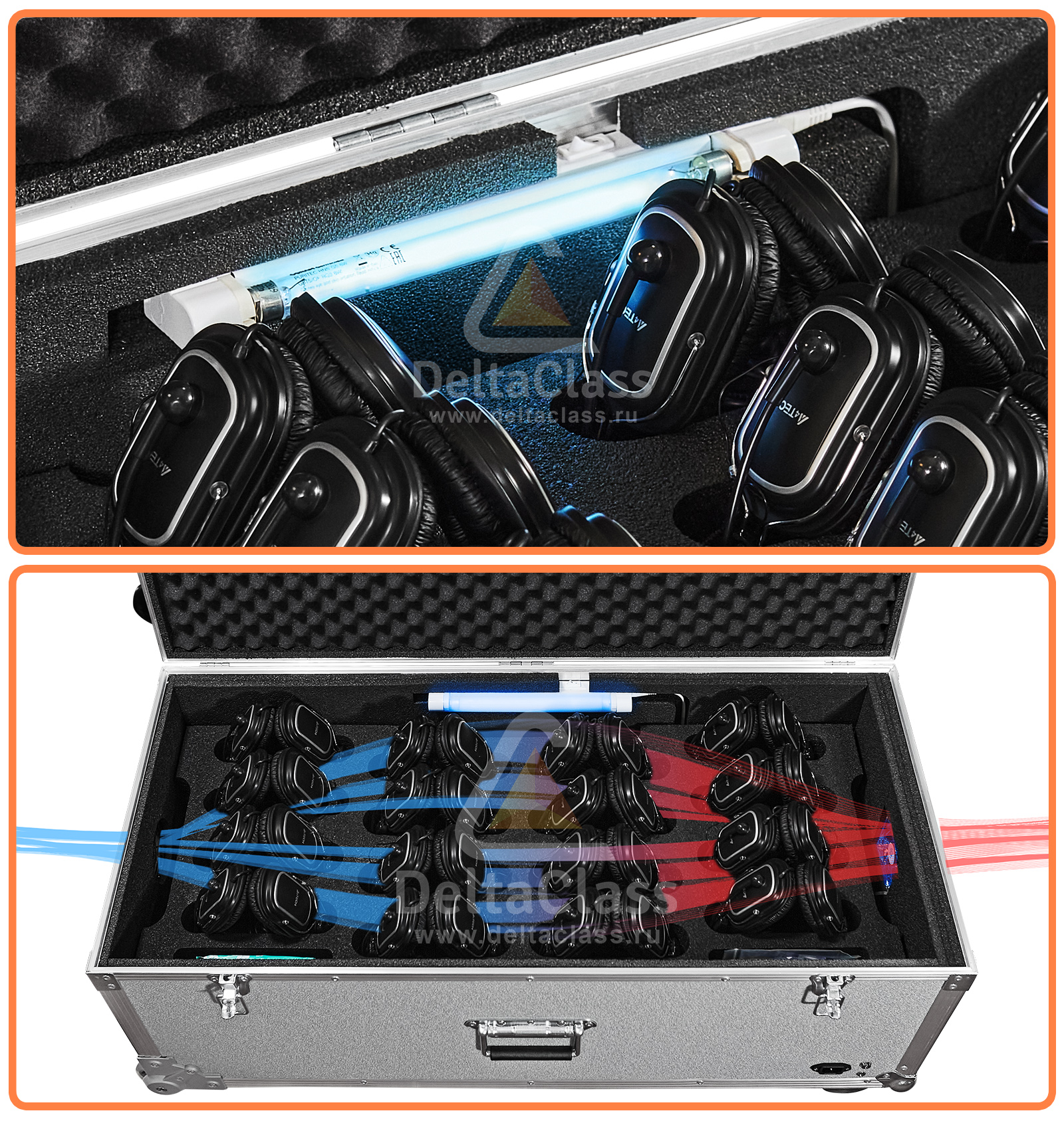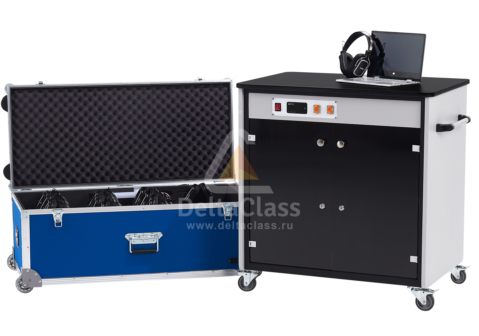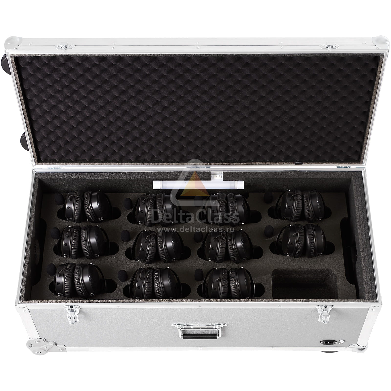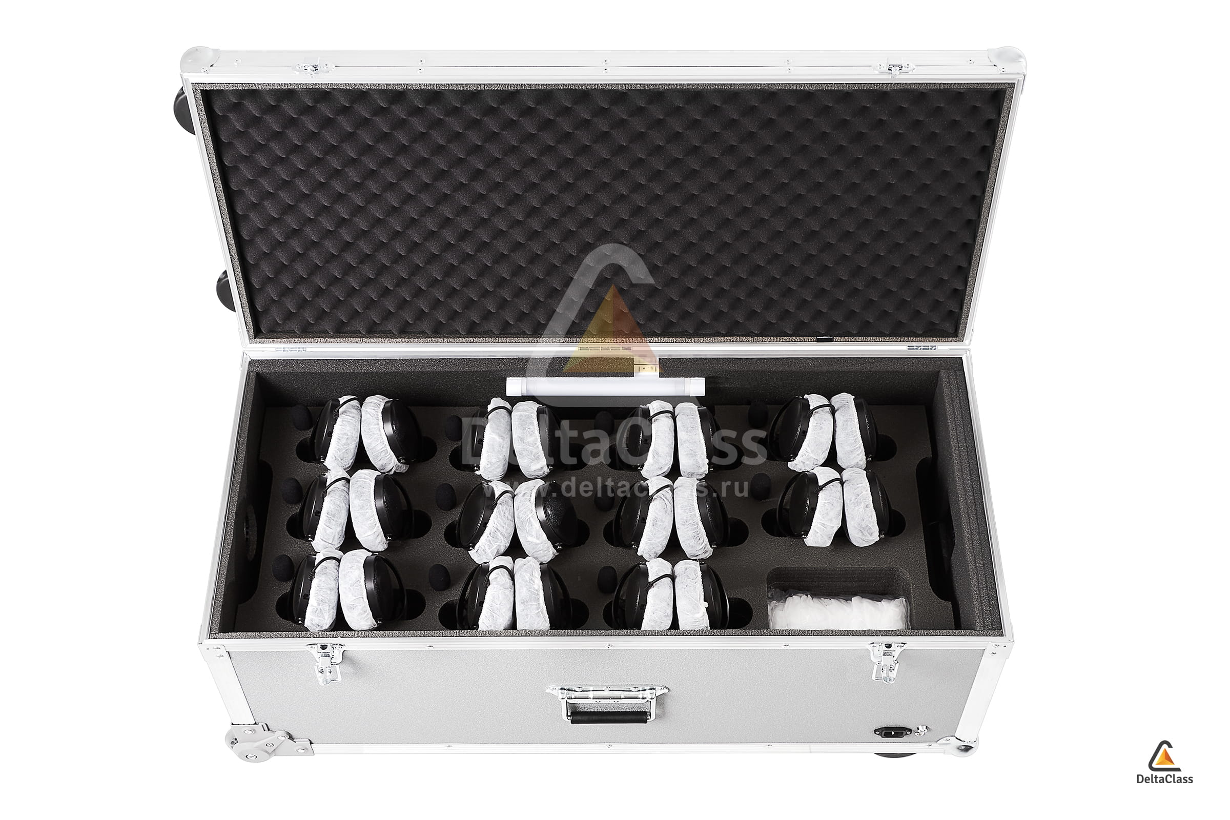 - Мягкий ложемент с индивидуальными ячейками для размещения до 20 лингафонных гарнитур