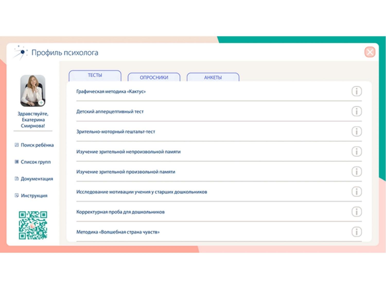 Тесты: Графическая методика «Кактус», Детский апперцептивный тест, Зрительно-моторный гештальт-тест Лоретты Бендер, «Изучение зрительной непроизвольной памяти», «Изучение зрительной произвольной памяти», «Корректурная проба для дошкольников», Методика «Волшебная страна чувств», Методика «Домик», Методика «Запоминание 10 слов», Методика «Запомни и расставь точки», Методика «Отгадывание загадок», Методика диагностики детских страхов и еще более 50 тестов.