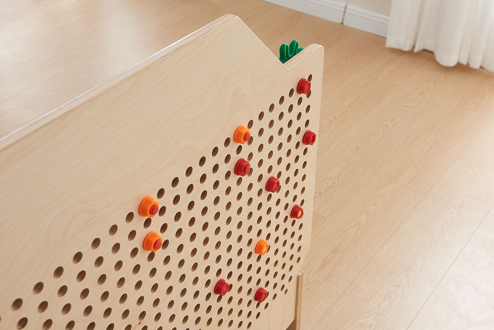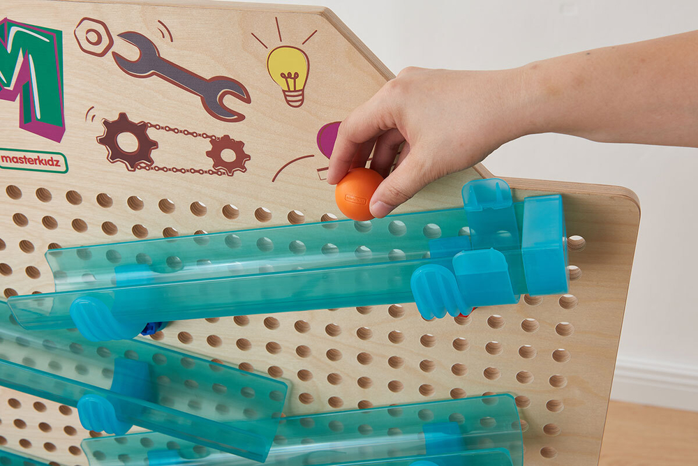 В комплект входят панели с отверстиями, есть возможность дополнительной установки развивающих пособий Masterkids, таких как колышки, сокровища, шнуровки, винты, кинетические треки.