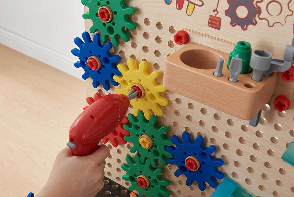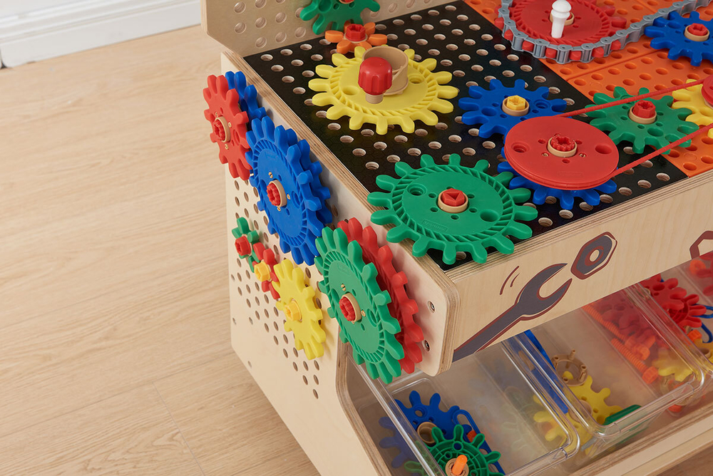 В верхней и боковой частях станции имеются сквозные отверстия для вкручивания винтов, шестеренок и крепления различных пособий, что позволяет задействовать в игровом процессе сразу несколько детей.