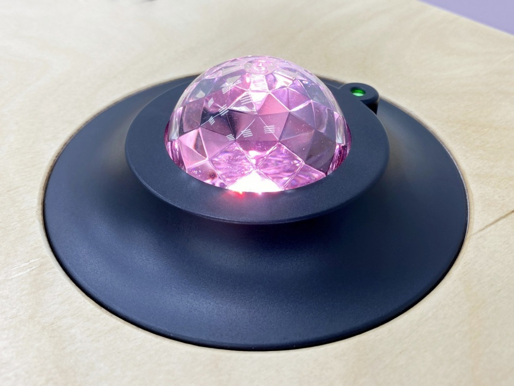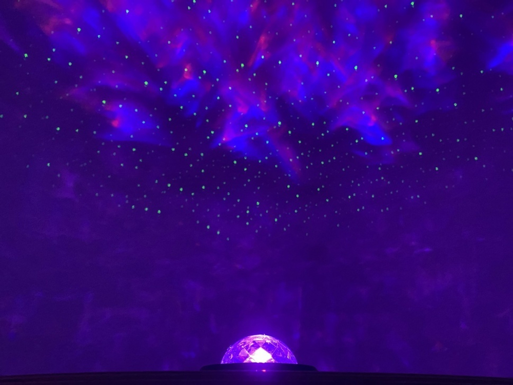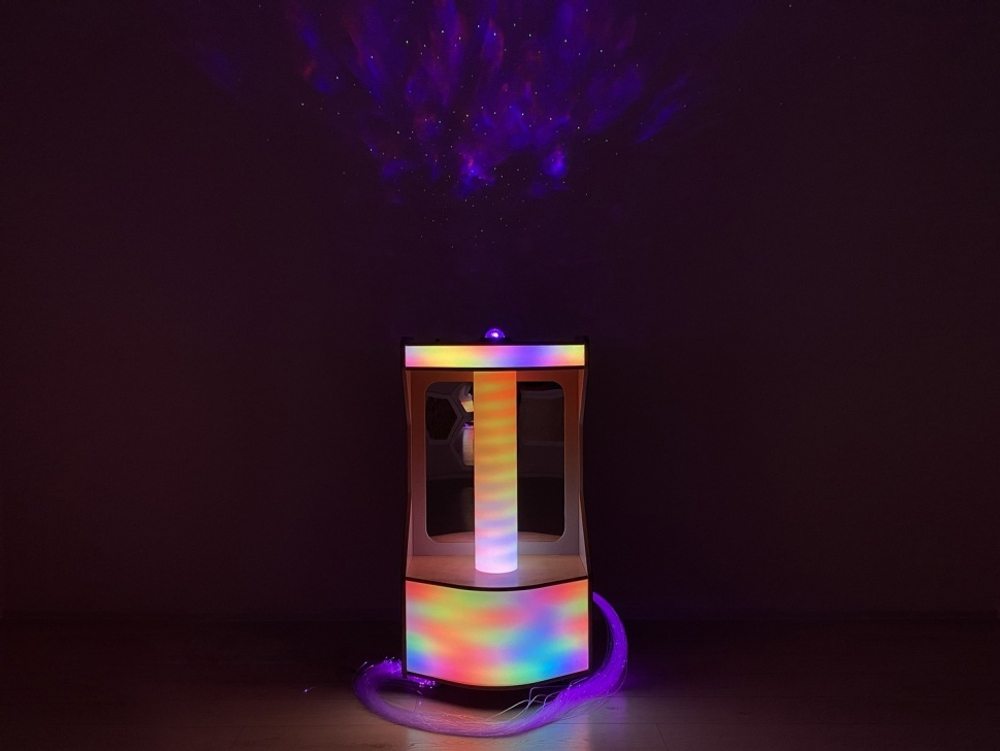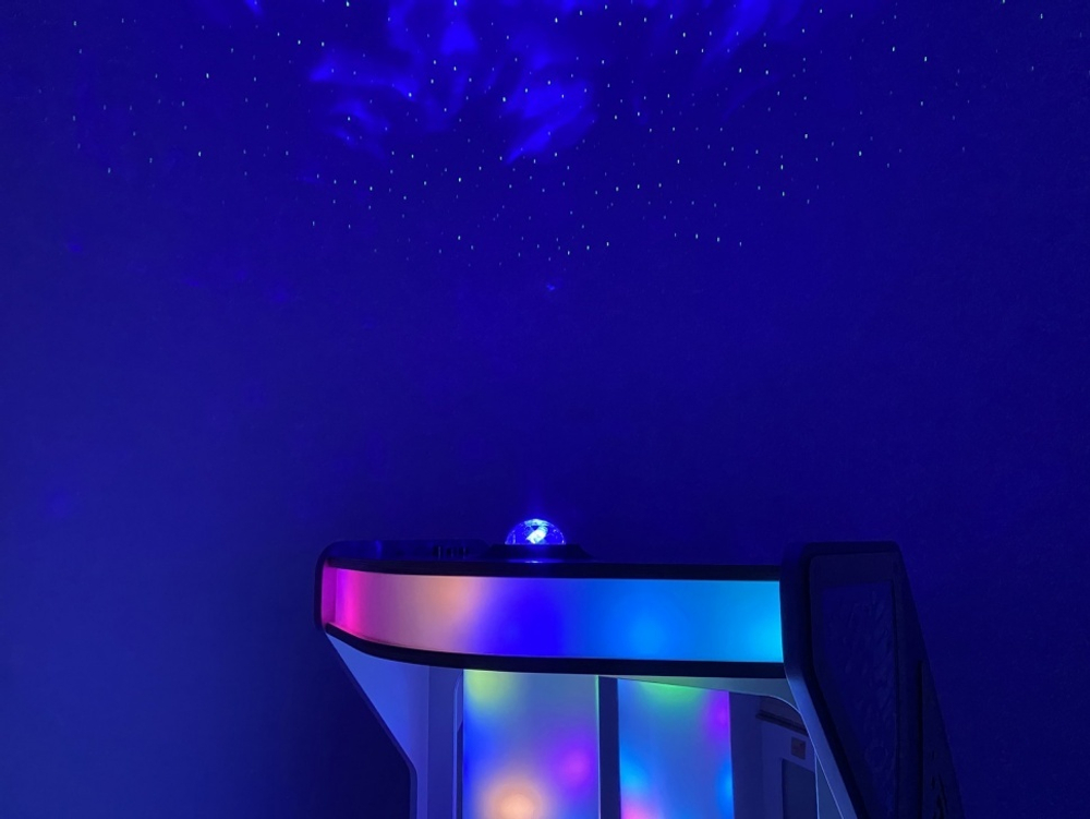 Сверху на крышке установлен проектор звёздного неба. С помощью него можно создать успокаивающую атмосферу расслабления и отключения от тревожных мыслей. Можно включить аудиосопровождение через колонку «Иллюминара» в сочетании с завораживающей проекцией звёздного неба на стены и потолок. У проектора есть 3 уровня яркости и 10 режимов переключения разных цветовых эффектов. Там же на крышке расположены кнопки управления музыкальной системой, встроенной в «Иллюминар». Музыку можно добавлять из вашего телефона, компьютера или другого устройства.