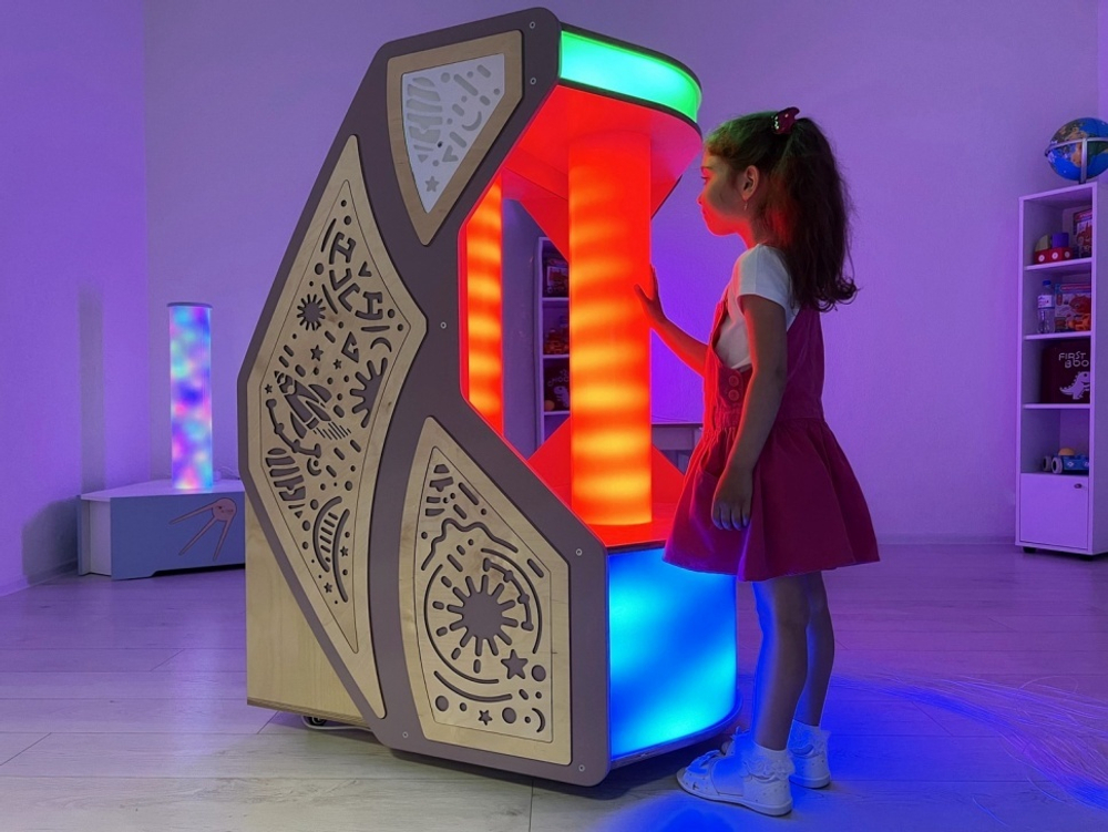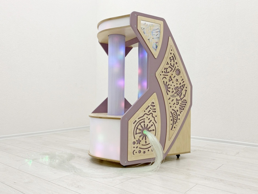Фонтан из фибероптического волокна – игровой тактильный элемент, дополняющий тему терапии светом: дети очень любят перебирать пальцами светящиеся нити, копошиться в них и заплетать, происходит переключение с напряжённых мыслей на тактильные ощущения.