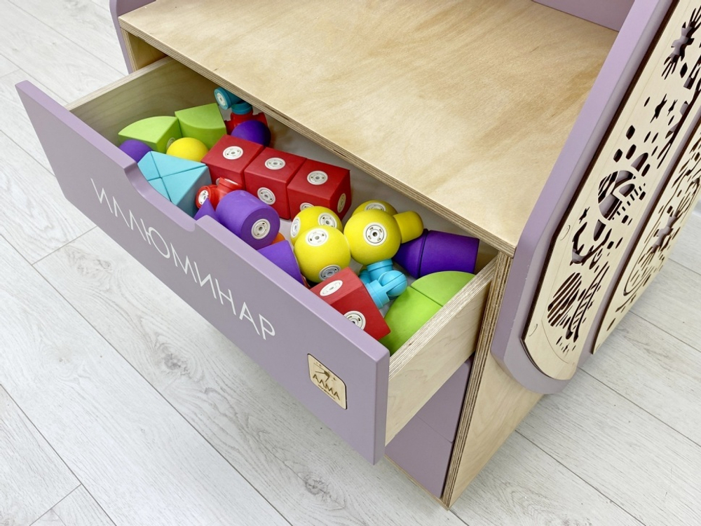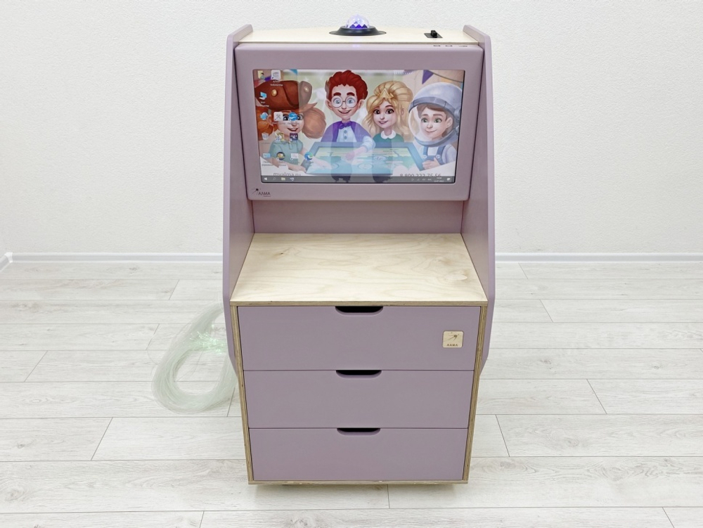 Эргономика «Иллюминара» продумана до мелочей: экран сенсорной панели располагается на удобной высоте для ребёнка, под сенсорной панелью три выдвижных ящика для игрушек и методического материала, на выступающей столешнице ящика можно рисовать, собирать конструктор, заниматься с дополнительным оборудованием, а можно облокотиться на столешницу, выполняя увлекательные задания на экране.