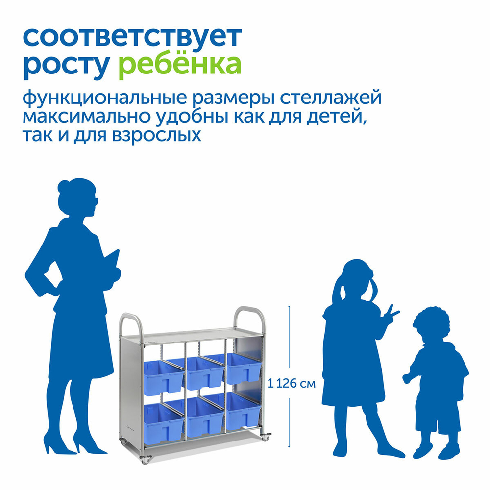 Мобильный металлический стеллаж Сенсориум – современное решение для организации пространства в ДОУ. Подходит для хранения и перемещения учебно-игрового оборудования, дидактического материала, конструктора, наглядных пособий, игрушек.