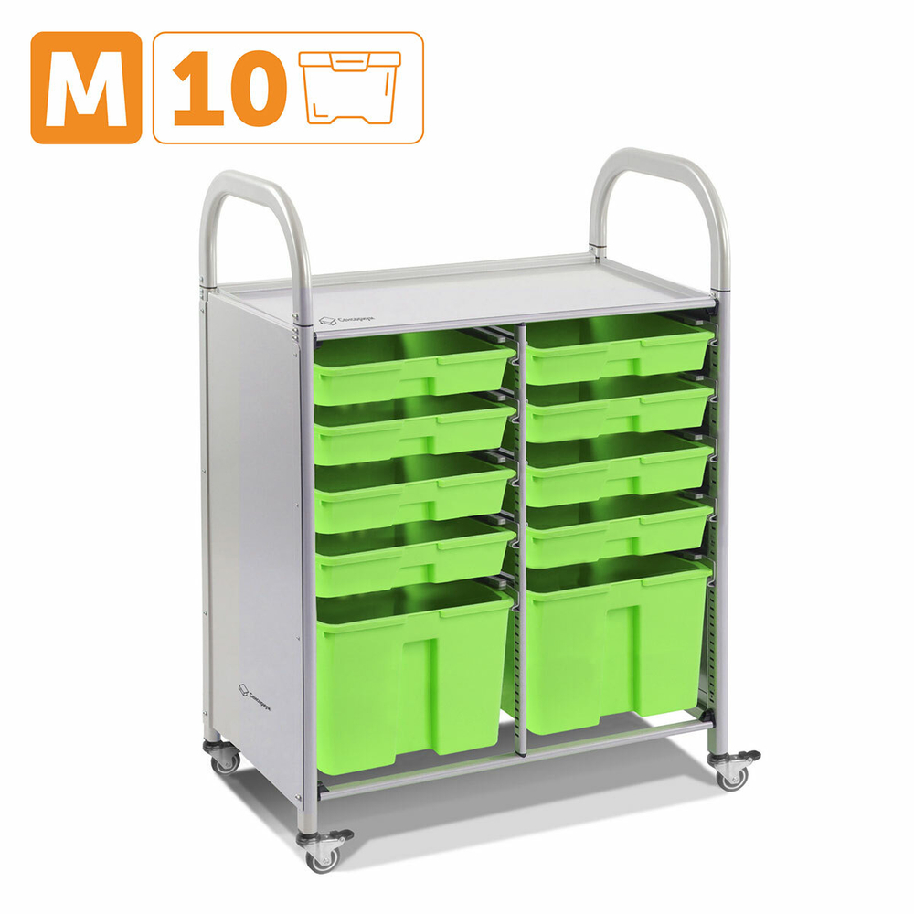 Компактная металлическая тележка с глубокими контейнерами оборудована направляющими, препятствующими выпадению контейнеров. Направляющие можно установить на любой высоте.