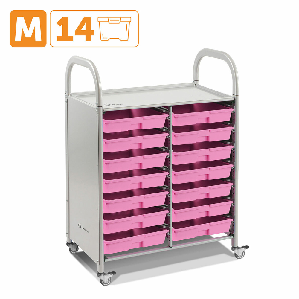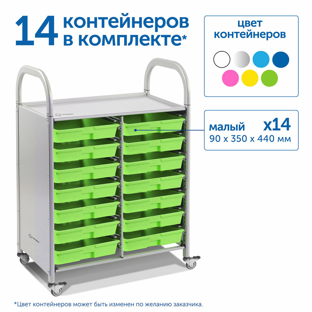 Компактная металлическая тележка с глубокими контейнерами оборудована направляющими, препятствующими выпадению контейнеров. Направляющие можно установить на любой высоте.
