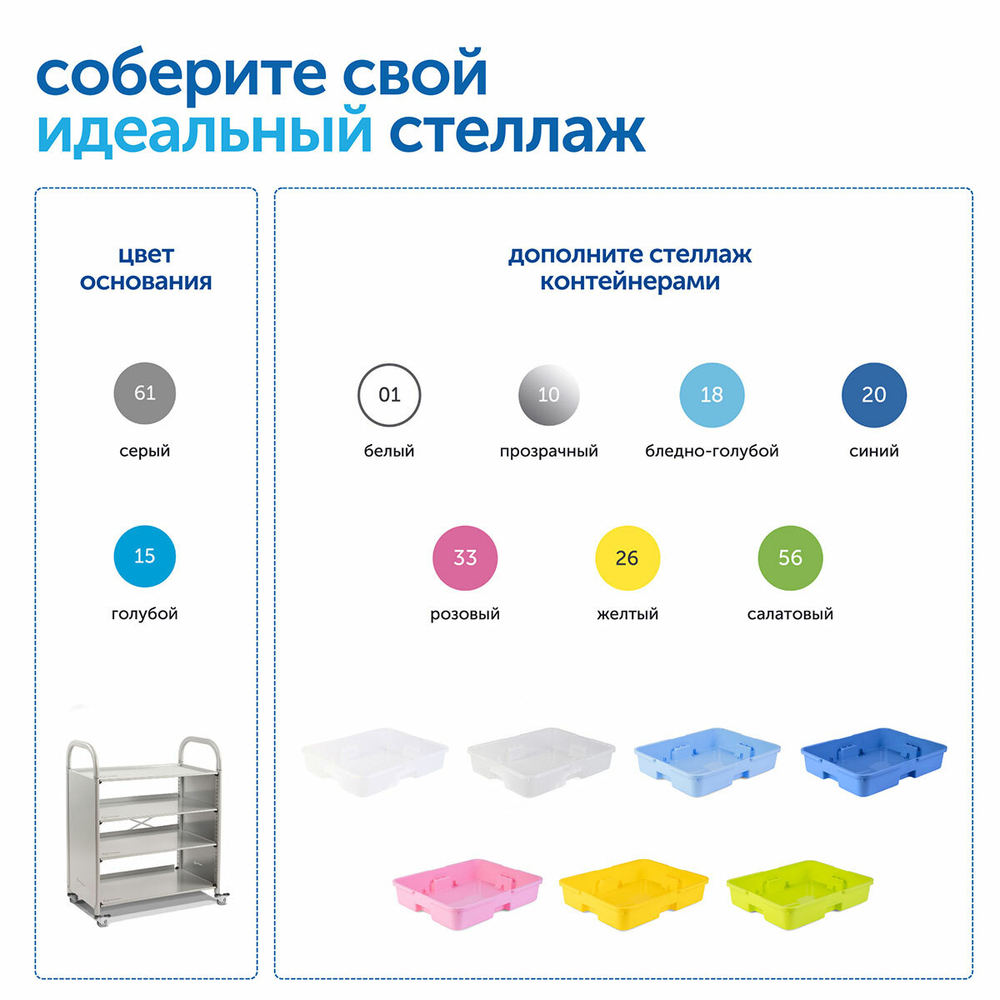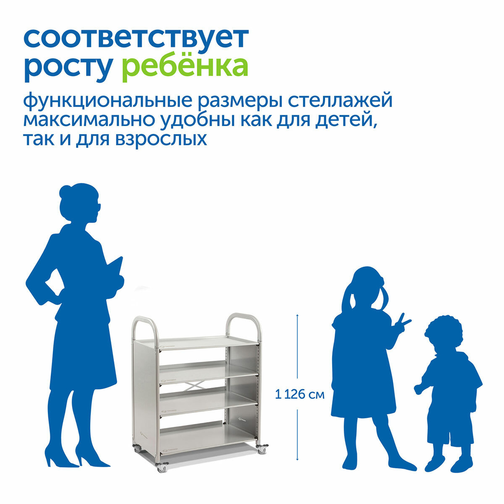 Мобильный металлический стеллаж Сенсориум – современное решение для организации пространства в ДОУ. Подходит для хранения и перемещения учебно-игрового оборудования, дидактического материала, конструктора, наглядных пособий, игрушек.