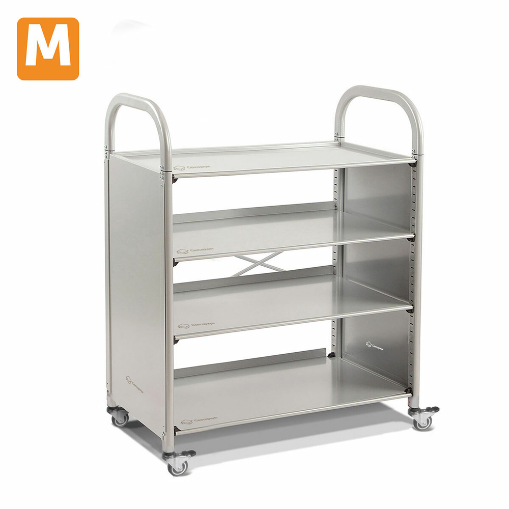 Компактная металлическая тележка подстраивается под любую площадь помещения. Полки изготовлены из стали с порошковым покрытием. Материал устойчив к царапинам.