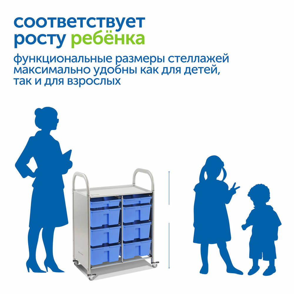 Мобильный металлический стеллаж Сенсориум – современное решение для организации пространства в ДОУ. Подходит для хранения и перемещения учебно-игрового оборудования, дидактического материала, конструктора, наглядных пособий, игрушек.