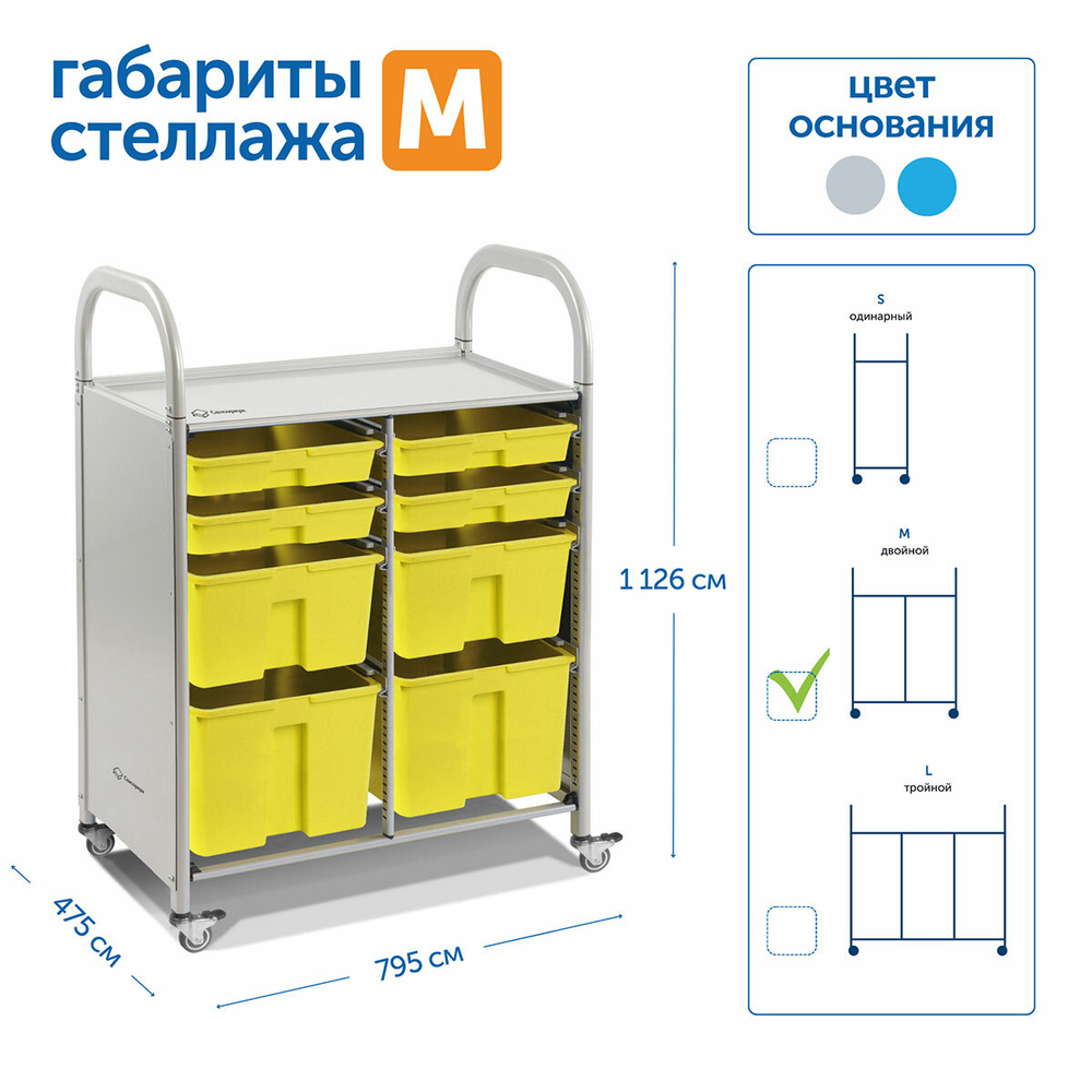 Мобильный металлический стеллаж Сенсориум – современное решение для организации пространства в ДОУ. Подходит для хранения и перемещения учебно-игрового оборудования, дидактического материала, конструктора, наглядных пособий, игрушек.