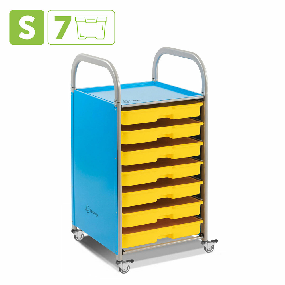 Компактная металлическая тележка с глубокими контейнерами оборудована направляющими, препятствующими выпадению контейнеров. Направляющие можно установить на любой высоте.