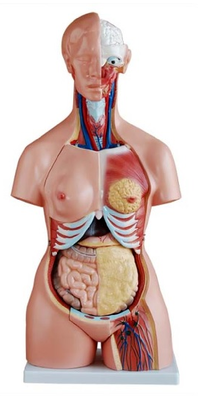Демонстрационная модель торса человека, разборная. Состоит из 21 части: туловище, женская грудная пластина, голова, глазное яблоко, мозг, позвонки, легкие (2 части), сердце (2 части), печень, почка, желудок, кишечник (2 части), мужские половые органы (2 части), женские половые органы с плодом (3 части), бесполая часть. Модель имеет открытый позвоночник от мозжечка до копчика. Материал - пластик ПВХ.