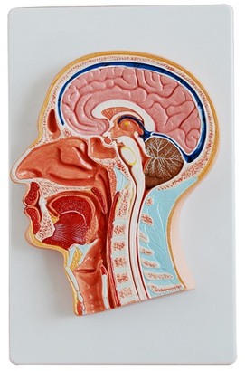 Демонстрационная рельефная модель с подробным изображением внутренних структур головы и шеи в саггитальном разрезе: отделы головного мозга, строение носовой и ротовой полостей, глотки, пищевода, гортани. Материал - пластик.