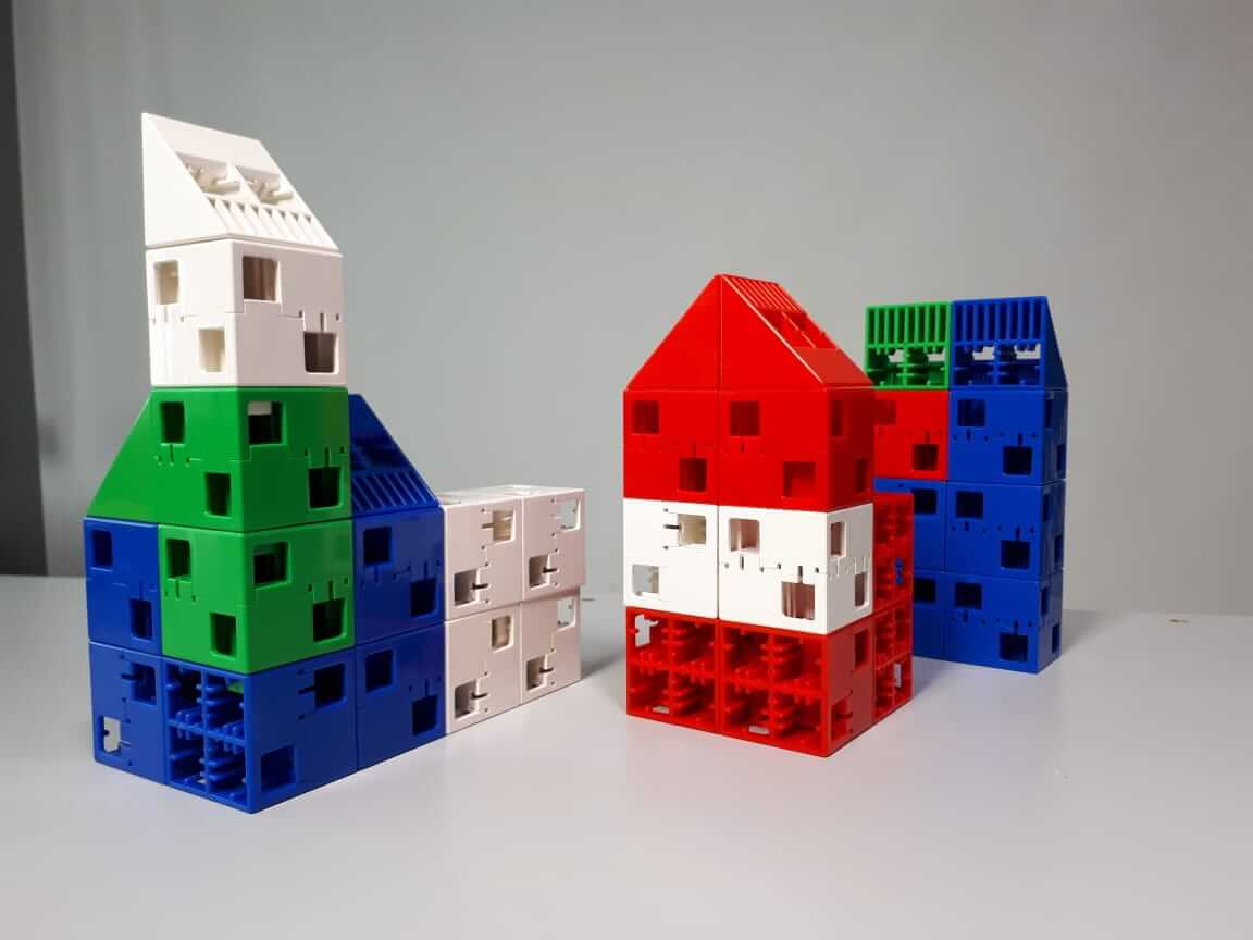 Один набор рассчитан на одновременную работу 1-2 детей. Чем больше наборов, тем больше детей в подгруппе могут заниматься одновременно. Сценарии занятий с набором могут быть расписаны педагогом на любое количество учебных часов – от 4-х месяцев до 1 года. Инновационные кубики – универсальная основа набора. Оригинальная запатентованная конструкция позволяет соединять их буквально во всех направлениях (более 50 комбинаций), вплоть до соединения вдоль главной диагонали кубов. Это значительно расширяет возможности по конструированию самых разнообразных объектов, начиная от традиционных дорожек и домиков, животных и машин и заканчивая фигурками современных роботов. Нам удалось свести элементную базу конструкторов до нескольких наименований, что позволяет решить вопрос взаимозаменяемости утраченных деталей.