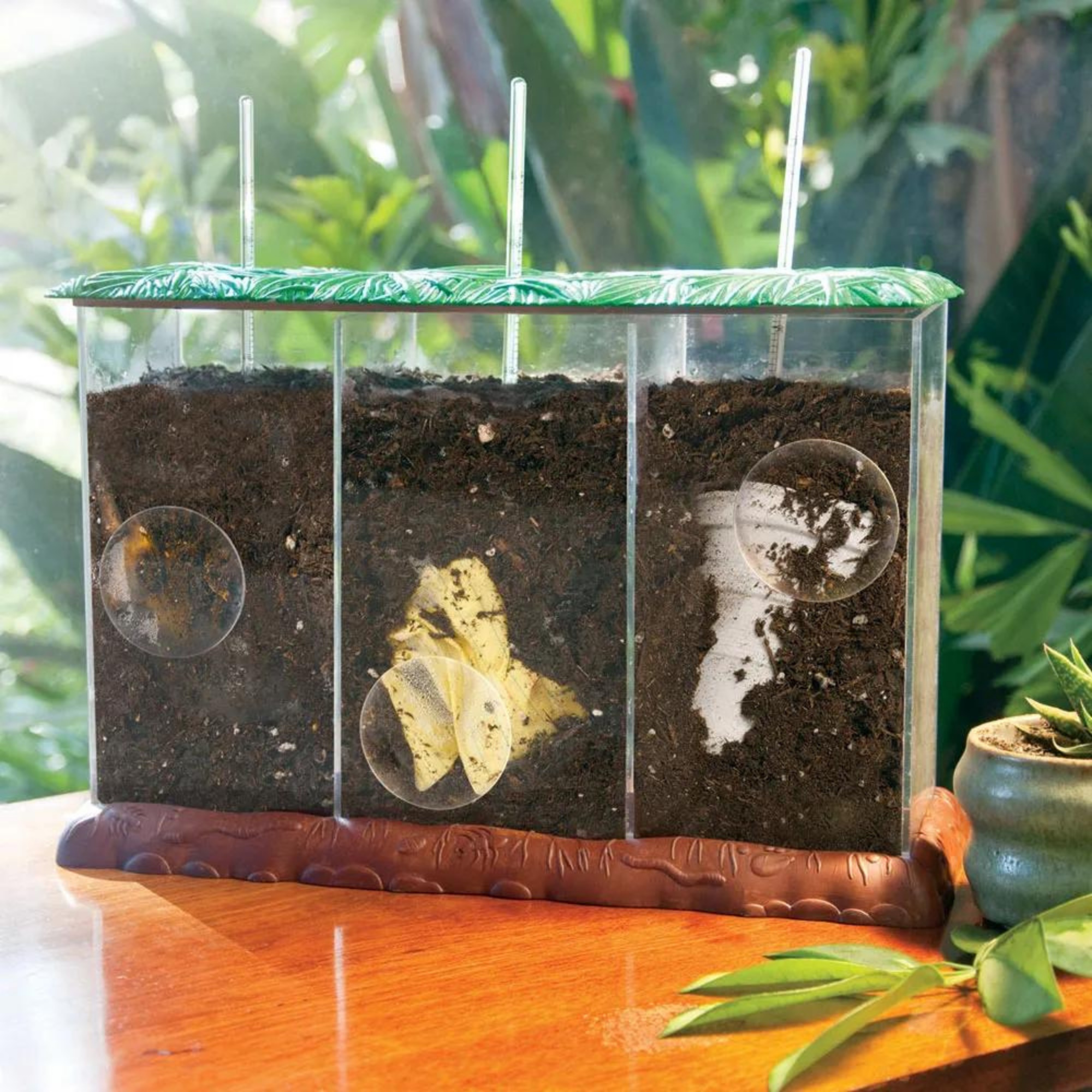 - Различать органические и неорганические отходы, используя компостный контейнер с 3 секциями.