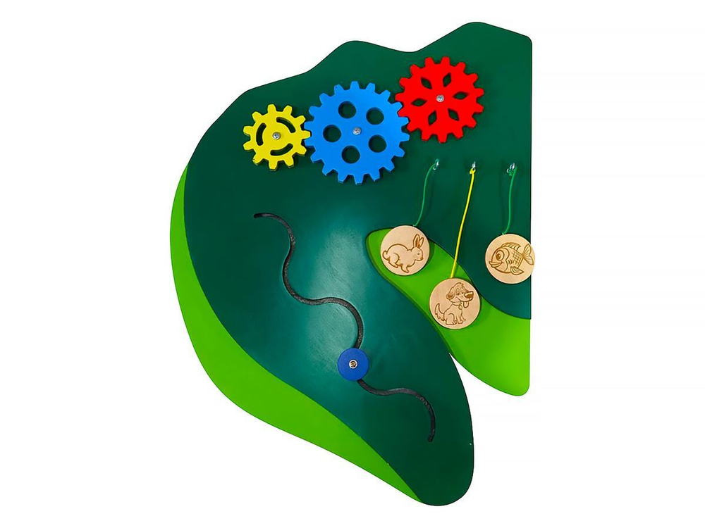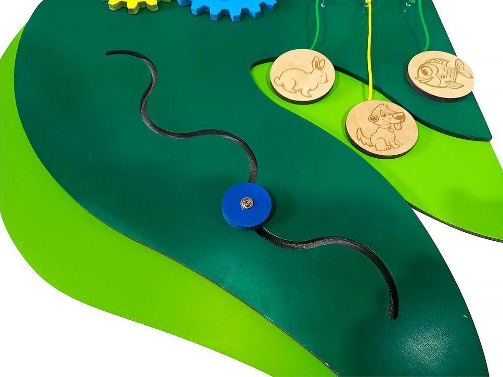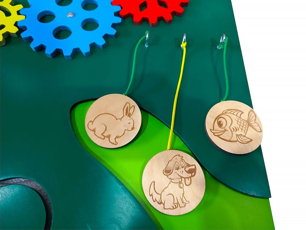 Под правой шестеренкой вкручены 3 металлических крючка, к которым за веревочки привязаны деревянные круглые медальоны с изображениями кролика, собаки и рыбки. Дети на ощупь изучают форму правильного круга и запоминают вид и названия животных, а также пробуют переплетать веревочки между собой и завязывать узлы, развивая при этом координацию и тренируя мышцы пальцев рук, подготавливаясь к письму в школе.