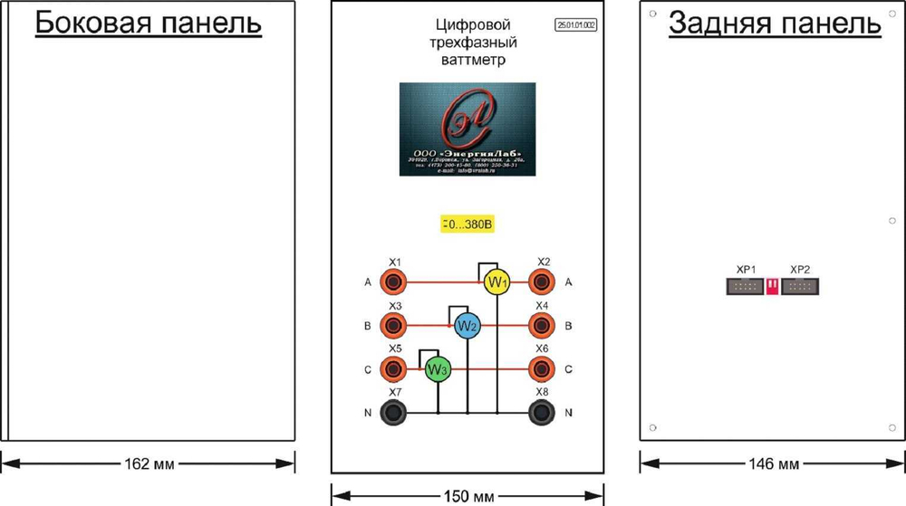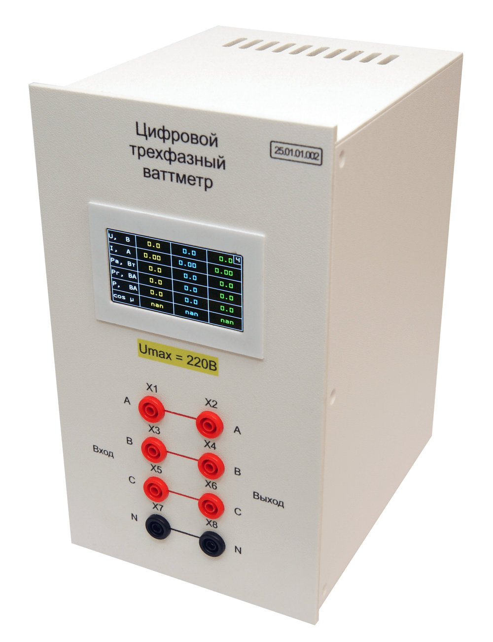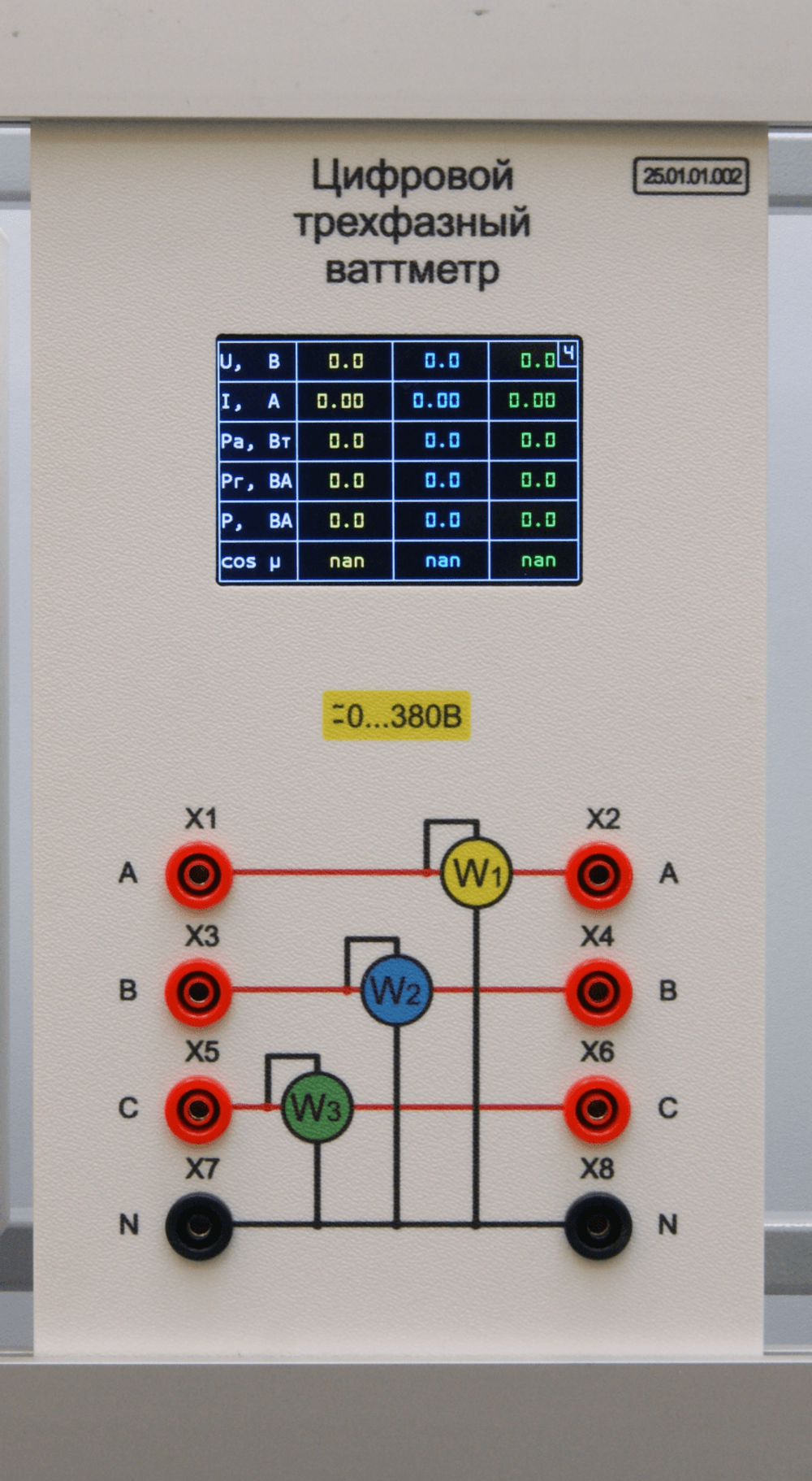 Модуль "Цифровой трехфазный ваттметр" (~0...380В) предназначен для измерения мощности, потребляемой от трехфазной сети.