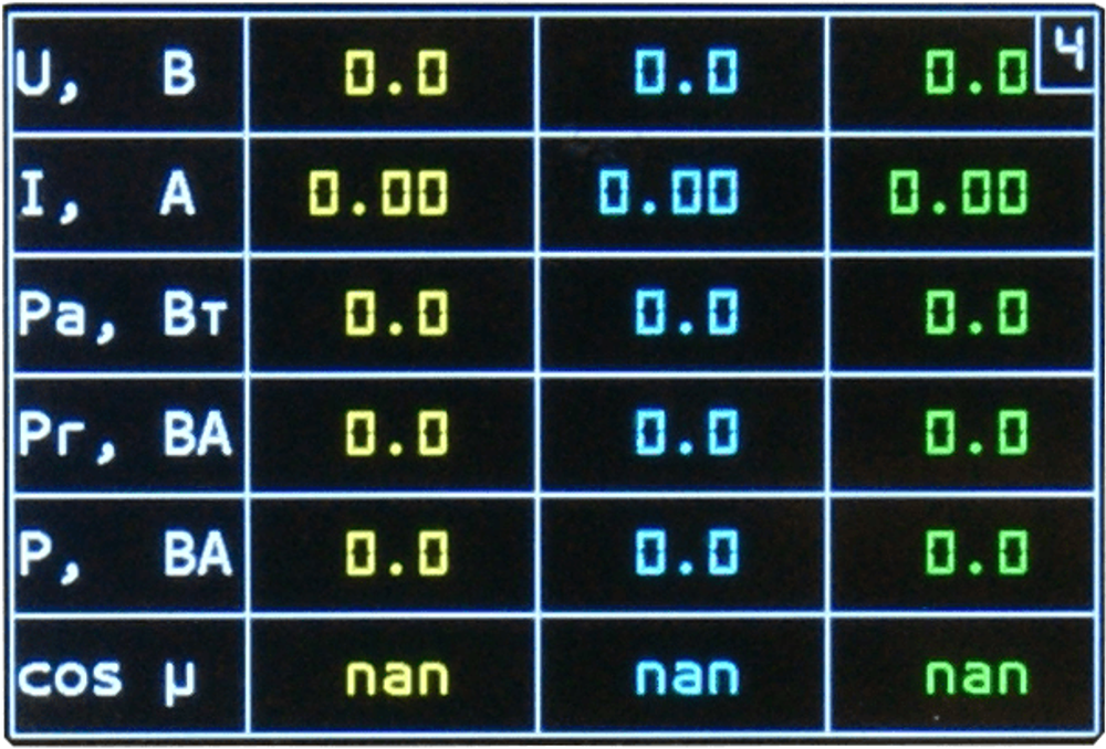На дисплее отображаются действующие значения тока и напряжения: полная, активная и реактивная мощности; косинус угла нагрузки.
