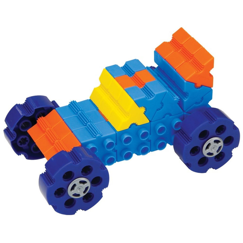 В комплекте конструктора 140 деталей всех цветов радуги, ярких и насыщенных, соединительные элементы, оси, что позволяет создавать множество различных моделей машин, от простых 2-хмерных (2D), до более сложных, объемных 3D-моделей. Первые шаги в конструировании моделей ребенок может легко сделать, всего лишь совместив детали конструктора со схемой сборки, представленной в масштабе 1:1 в инструкциях формата А3 (начальный уровень сложности инструкции по сборке).