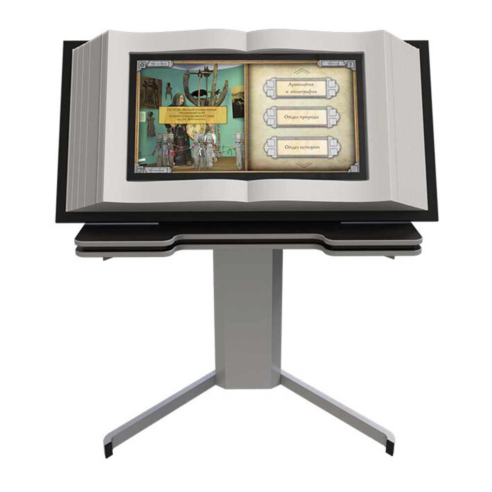 С помощью такого мультимедийного устройства демонстрируются видео, фотографии, информация о экспонатах либо товарах, даже старинные манускрипты, антикварные сборники или государственные документы.