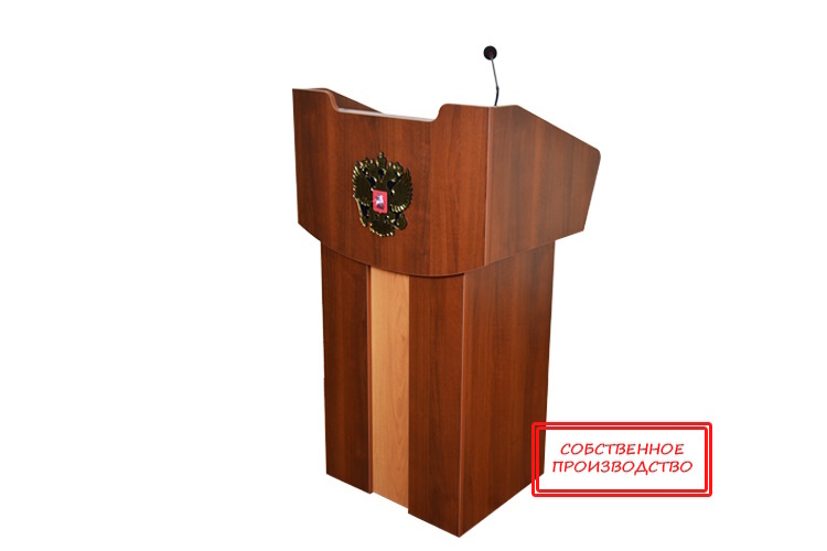 Корпус трибуны выполнен из ламинированной ДСП на четырех поворотных колесах, что делает ее мобильной. По запросу клиента на корпусе располагается герб РФ либо логотип учреждения. Цвет корпуса также выбирается заказчиком.