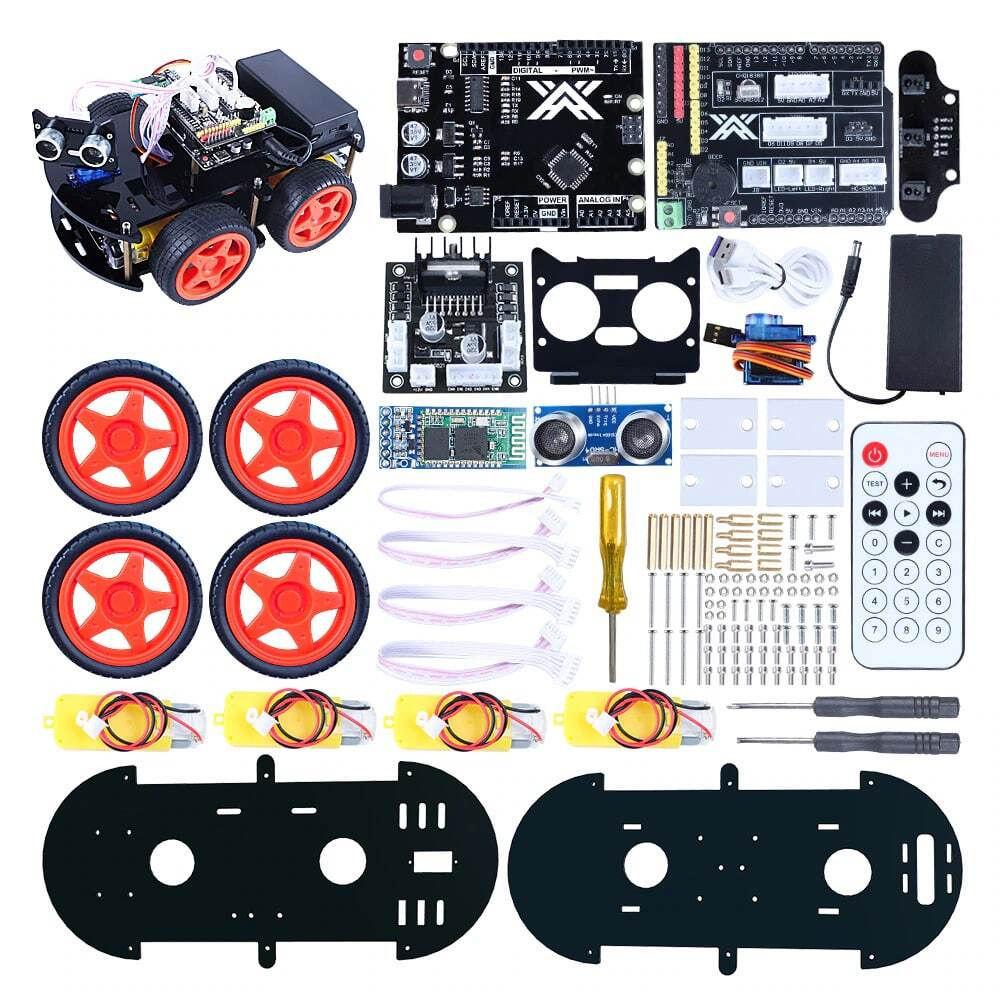 В набор поставки включены микроконтроллер, датчики, модуль Bluetooth, приводы, провода, плата и другие комплектующие. Собранная на плате Ардуино машина способна передвигаться по заданной траектории, разворачиваться, двигаться с разной скоростью. Arduino Car Robot не нуждается в пайке – все элементы собираются и разбираются вручную. Контроллер поддерживает управление с пульта либо смартфона.