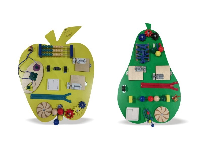 Бизиборды выполнены в виде знакомых детям фруктов – желтого яблока и зеленой груши, и потому сразу привлекают внимание малышей;