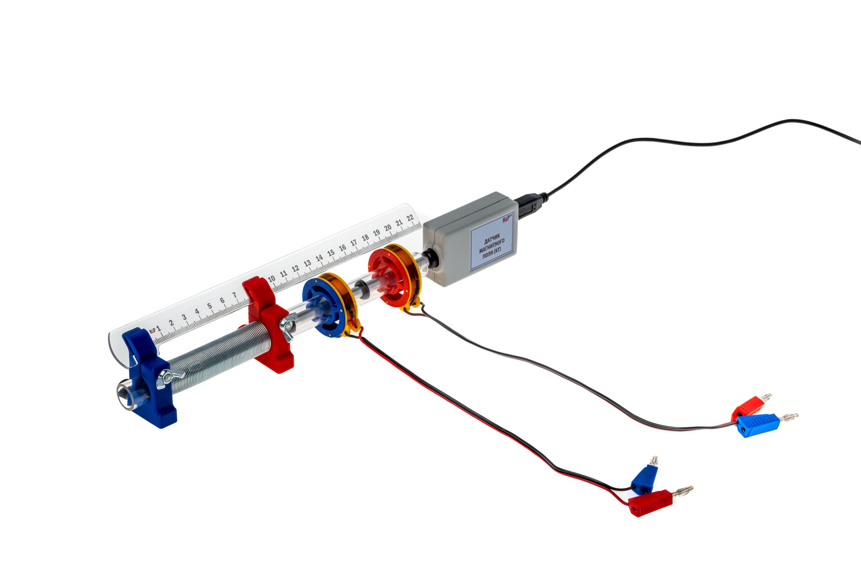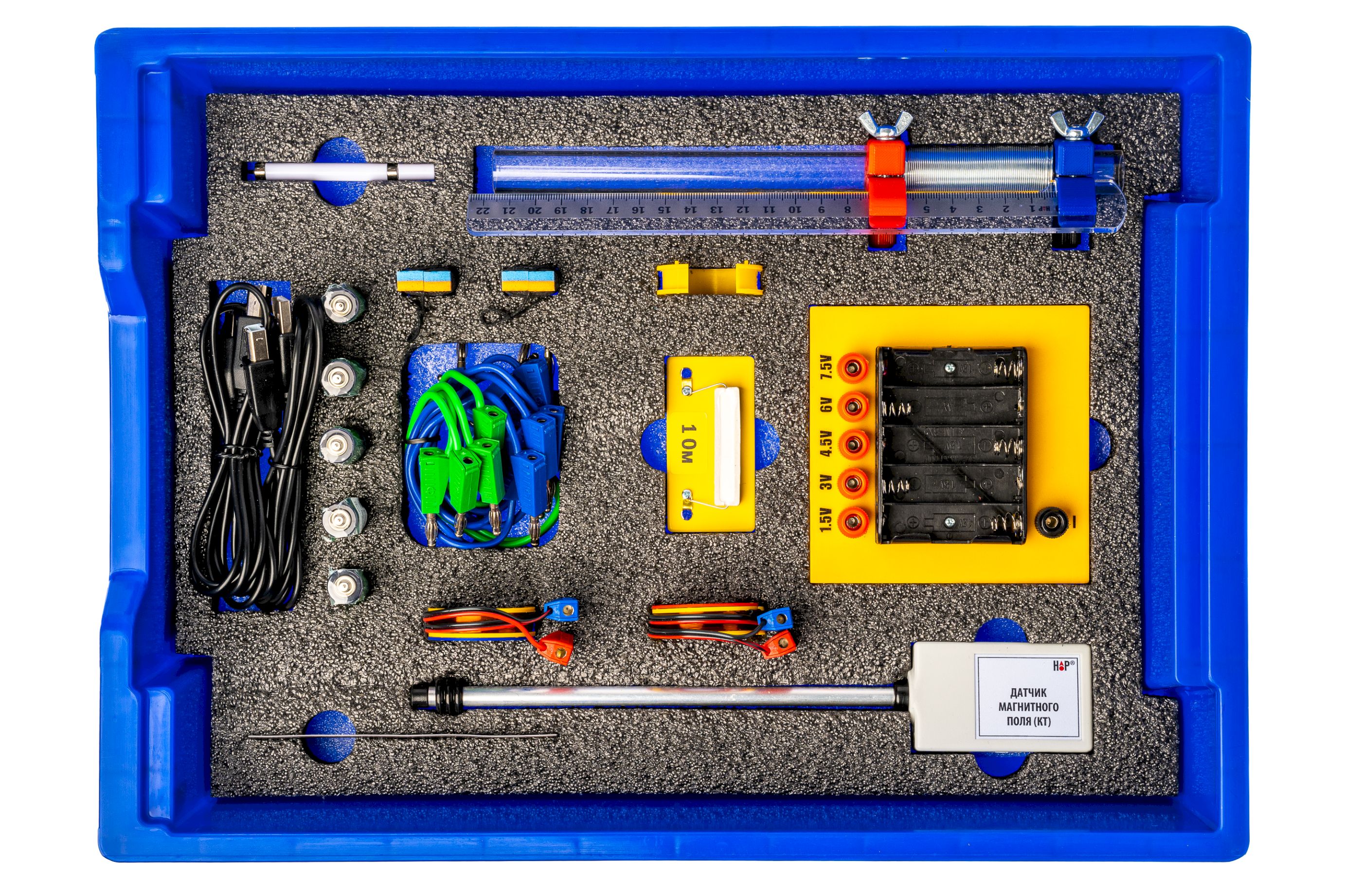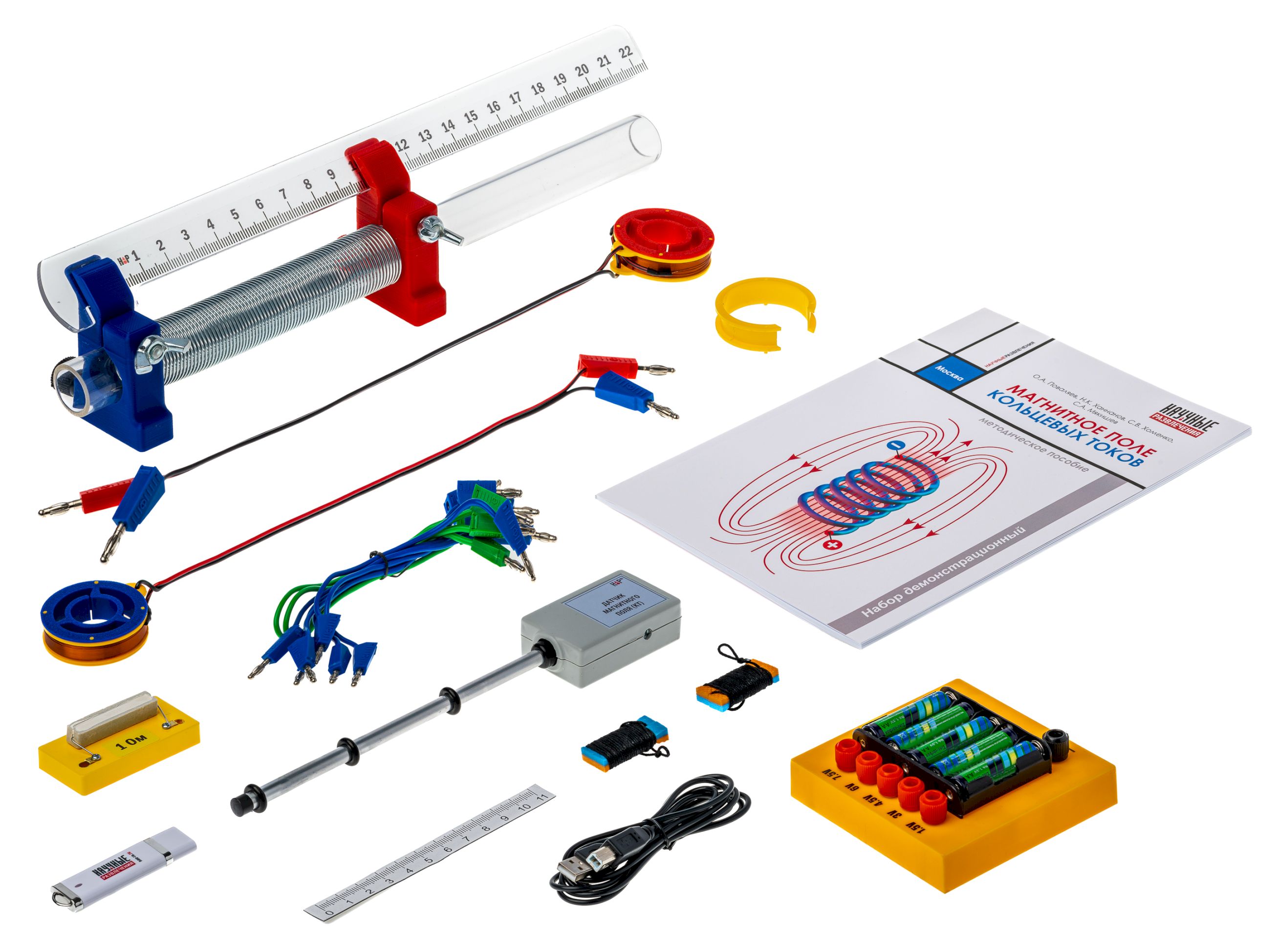 Набор демонстрационный предназначен для экспериментальной демонстрации магнитного поля, создаваемого электрическим током и силового взаимодействия между проводниками при протекании по ним электрического тока. Набор обеспечивает изучение основных понятий и закономерностей, изучаемых по темам «Магнитное поле тока» и сила Ампера, а также решение исследовательских задач, связанных со магнитным взаимодействием и структурой магнитного поля, создаваемого катушками различной геометрии.