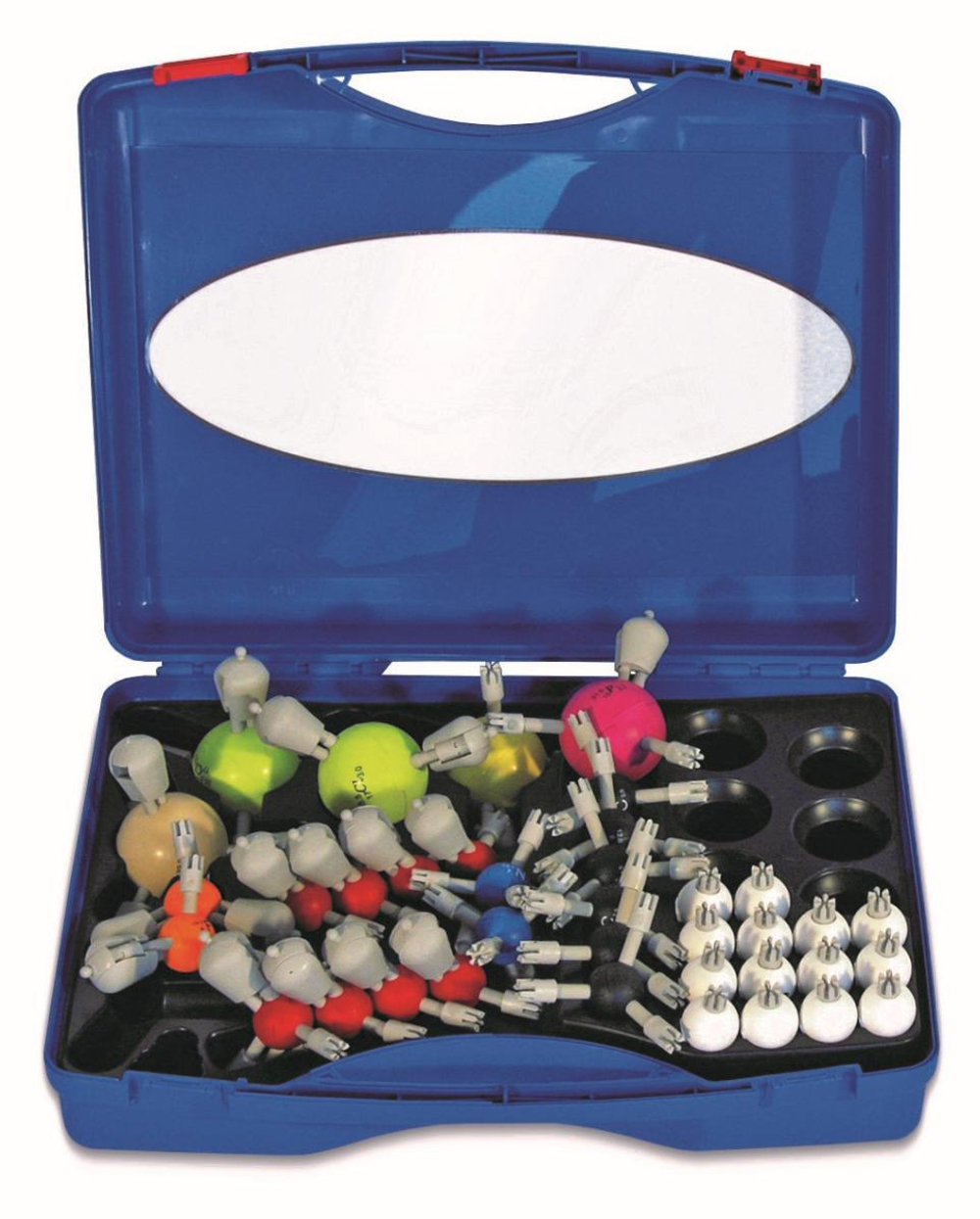 Набор состоит из 17 видов моделей атомов разных веществ двух диаметров (3 и 6 сантиметров). Модели атомов имеют соединительные элементы, равные валентности атомов. Размеры моделей атомов позволяют использовать комплект в качестве демонстрационного учебного пособия.