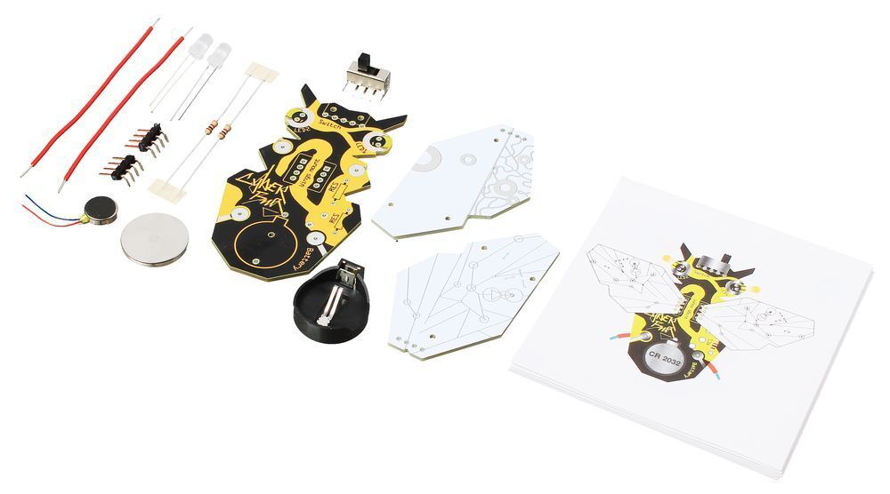 Внутри набора — печатная плата и необходимые компоненты, чтобы спаять вибрирующего кибержука с питанием от батарейки CR2032.