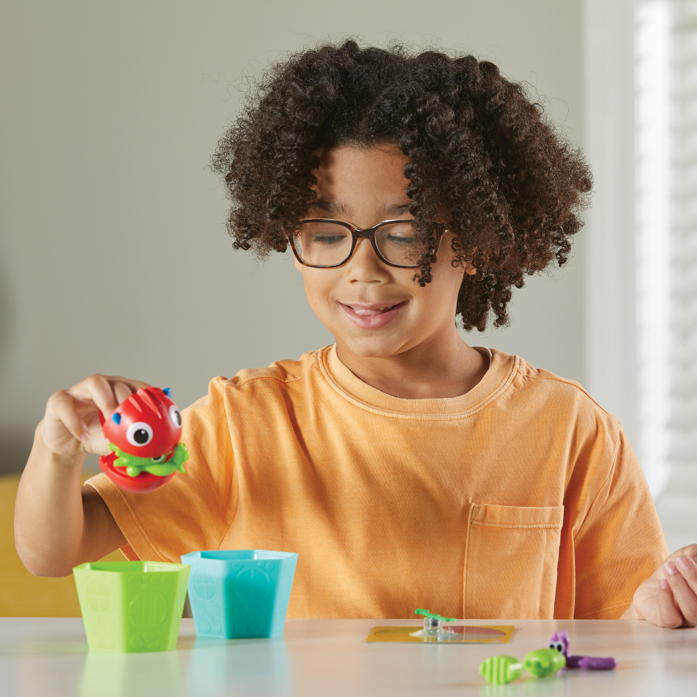 Раскрутите спиннер и узнайте количество и цвет фигурок, которых нужно распределить в соответствующий домик. Предложите ребёнку выбрать щипцы и приступить к игре. Проверьте работу вместе и, если нужно, исправьте ошибки.