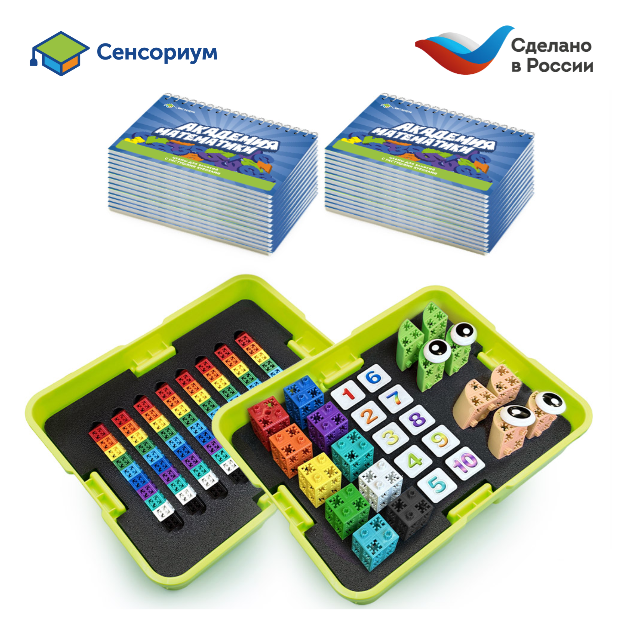 Основа комплекта — инновационные «Растущие кубики Сенсориум». Это первые кубики, соединяющиеся со всех 6 сторон, которые служат готовой дидактической системой для изучения арифметики.