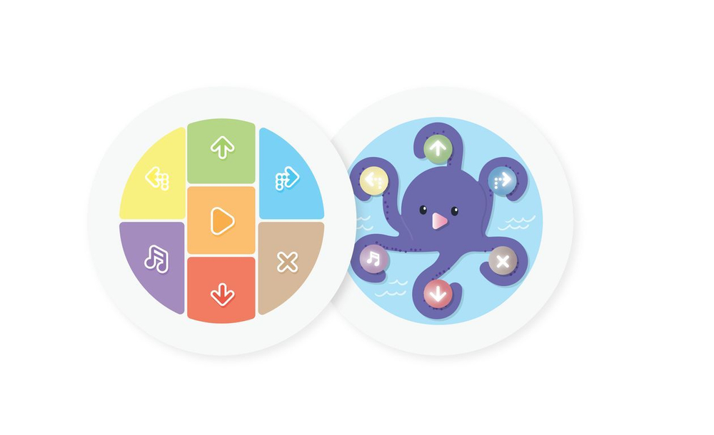 Нажимая клавиши со стрелками на Контроллере, Вы можете запрограммировать направление движения робота. Контроллер оснащен цветовыми индикаторами (зеленый, синий, желтый, красный и т.д.). Данная функция поможет детям лучше запомнить заданные команды и даст возможность исправить алгоритм.