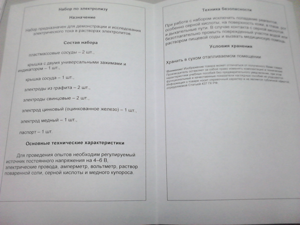 Набор позволяет исследовать проводимость различных веществ, измерить электрохимический эквивалент меди, произвести электролиз воды, продемонстрировать химическое действие тока, устройство и действие гальванического элемента и аккумулятора, гальваническое покрытие. В комплект входят: пластмассовые сосуды – 2 шт., крышка с двумя универсальными зажимами и индикатором – 1 шт., крышка сосуда – 1 шт., электроды – 2 шт., электрод цинковый (оцинкованное железо) – 1 шт., электрод медный – 1 шт., контактор – 1 шт., руководство по эксплуатации – 1 шт. Технические характеристики и комплектность Габаритные размеры в упаковке (дл.*шир.*выс.), см. 16*12*12 Вес, кг, не более 0,27 объем, м3, не более 0,002