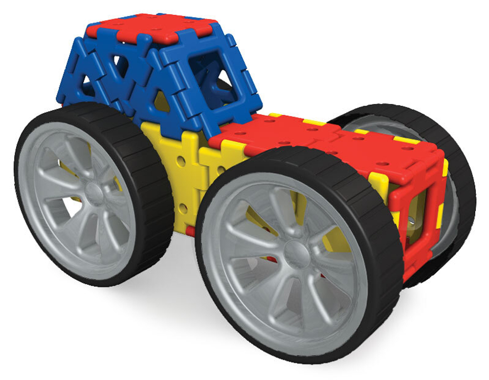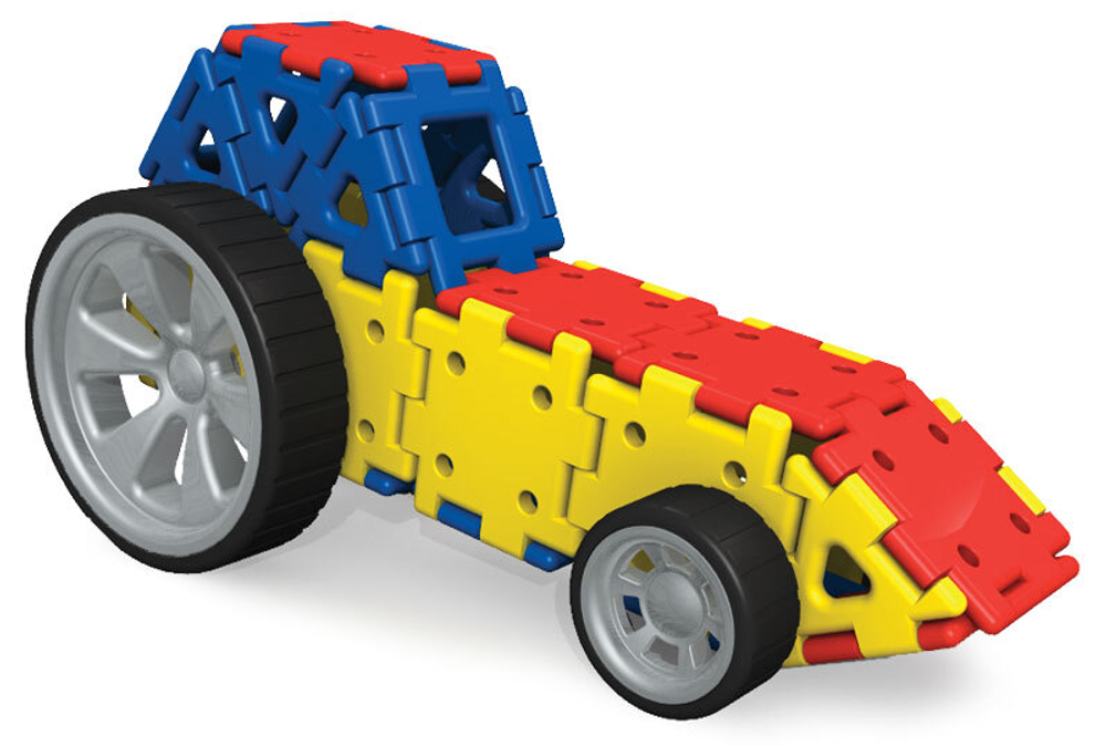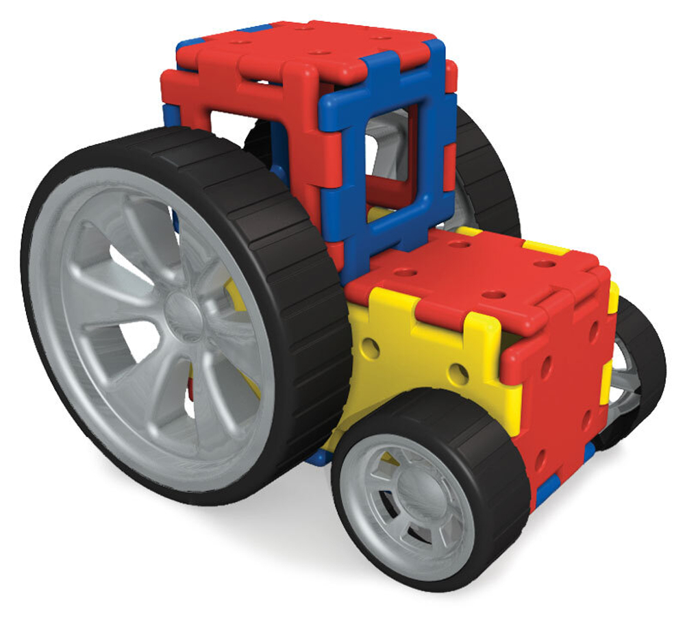 Собранный из квадратов и колес своими руками автомобиль приводит ребенка в восторг и наполняет его гордостью за собранную большую машину, на которой он может посидеть и даже прокатиться. С помощью колес двух разных размеров можно построить огромное количество великолепных устройств.