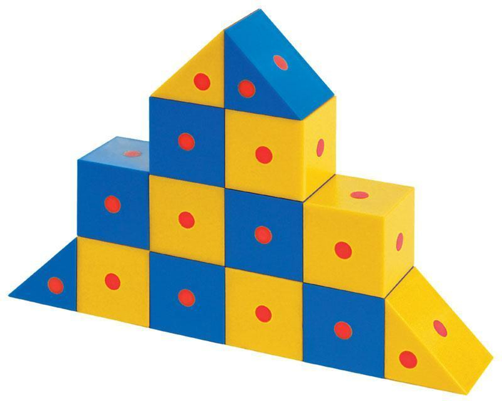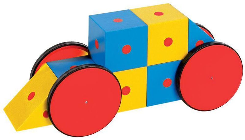 Набор состоит из 20 пластиковых магнитных блоков двух разных цветов (10 кубиков, 6 объемных прямоугольных треугольников, 4 набора колес).
