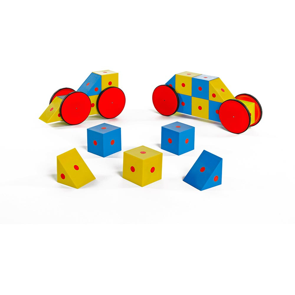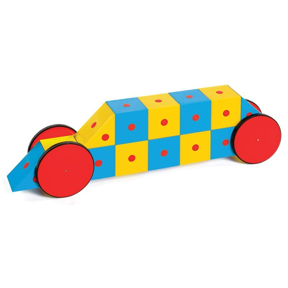 Детали желтого цвета соединяются только с деталями голубого цвета. Дети могут с легкостью конструировать разнообразные транспортные средства, а также добавлять фигурки в качестве водителей.