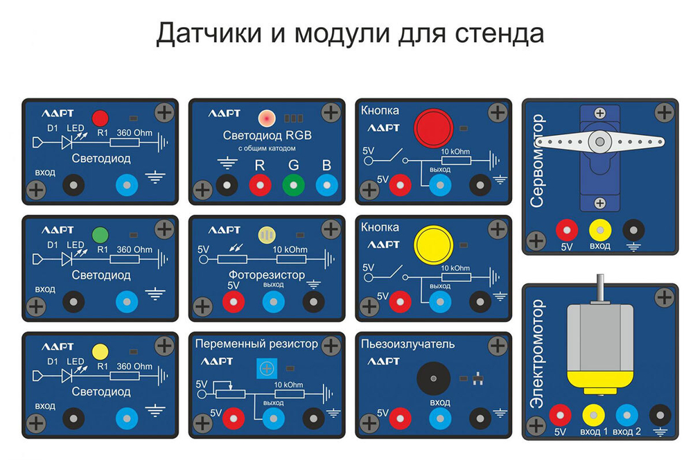 Для работы со стендом в состав набора включены стандартные датчики и модули с помощью которых ученик может создавать проекты различной сложности.