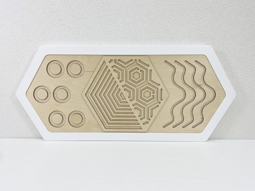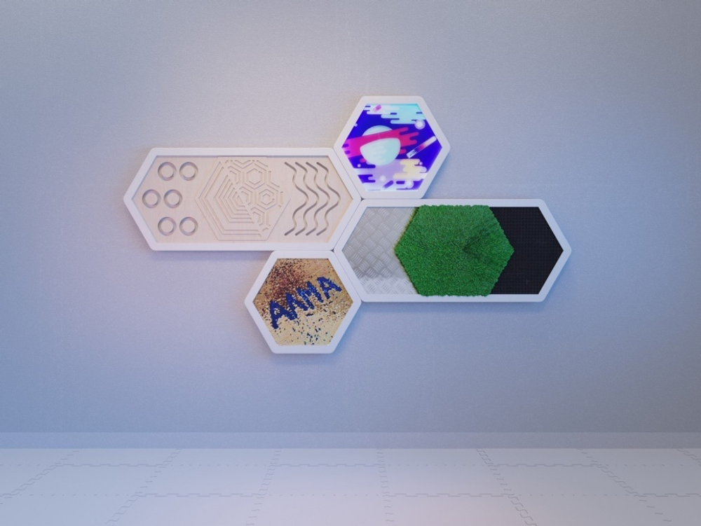 Состоит из четырёх шестигранных панелей, покрытых различными материалами: ворс, пайетки, дерево, металл, акриловый пластик, зеркало, натуральный камень. Благодаря различным фактурам, рельефам, звукам и температурным ощущениям ребёнок приобретает новый тактильный опыт, учится классифицировать материалы по отдельным категориям и сравнивать их свойства. Это хорошо отражается на развитии малышей, ведь чем разнообразнее палитра тактильных ощущений, тем лучше развивается мозг, в частности, зоны, отвечающие за анализ информации и развитие речи.
