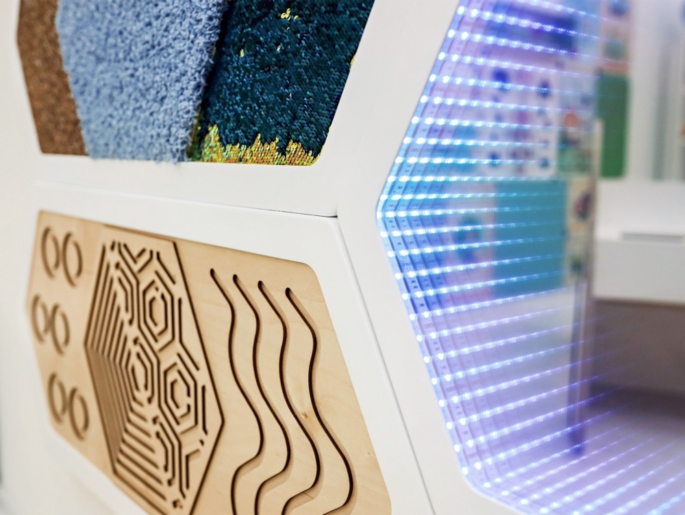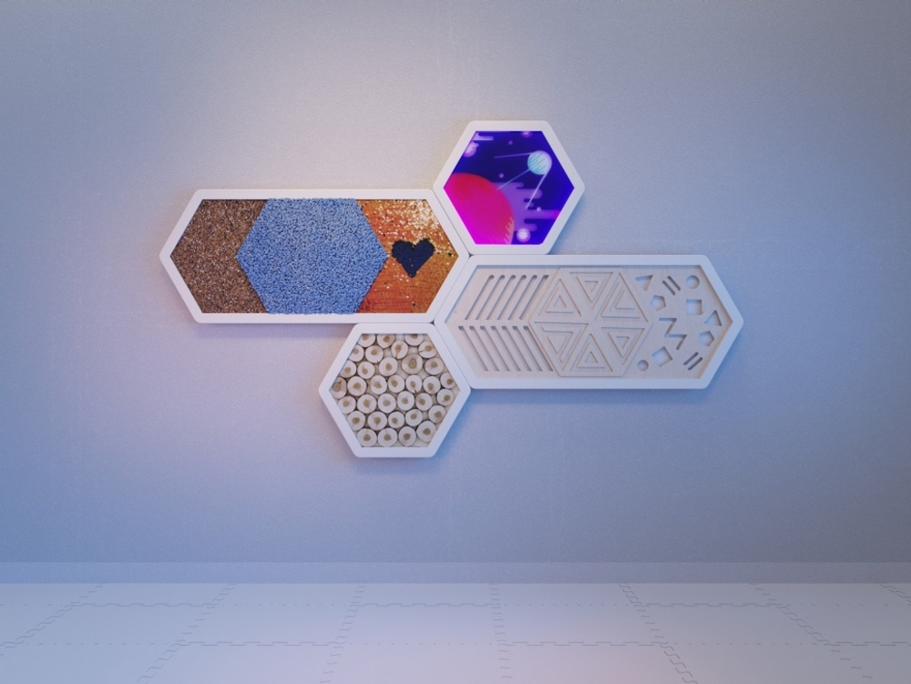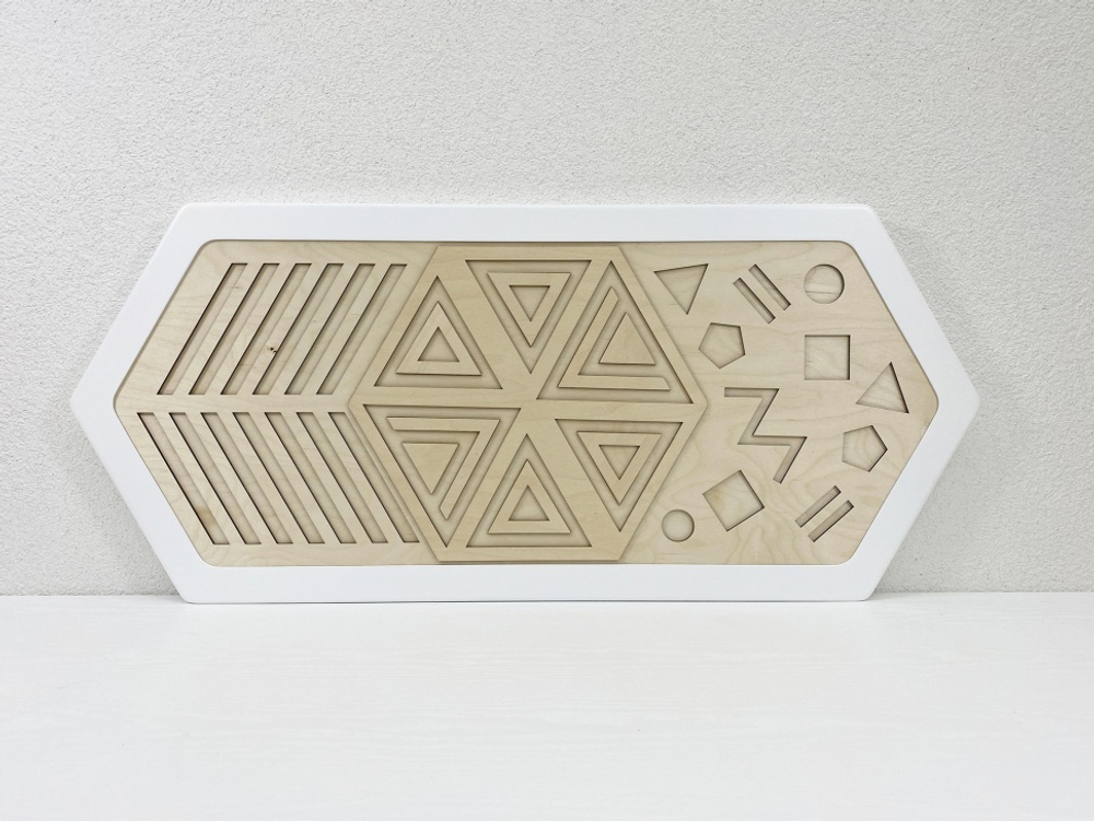Состоит из четырёх шестигранных панелей, покрытых различными материалами: ворс, пайетки, дерево, металл, акриловый пластик, зеркало, натуральный камень. Благодаря различным фактурам, рельефам, звукам и температурным ощущениям ребёнок приобретает новый тактильный опыт, учится классифицировать материалы по отдельным категориям и сравнивать их свойства. Это хорошо отражается на развитии малышей, ведь чем разнообразнее палитра тактильных ощущений, тем лучше развивается мозг, в частности, зоны, отвечающие за анализ информации и развитие речи.