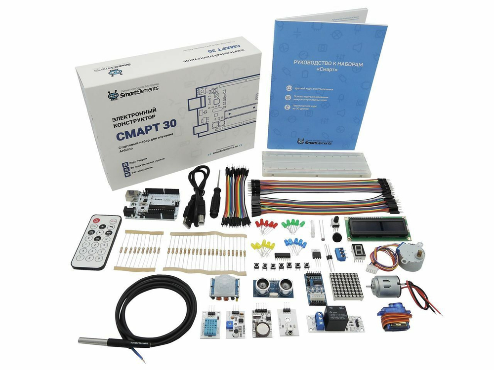 Сердцем набора «Смарт 30» является микроконтроллерная плата Smart Uno, являющаяся точной копией оригинальной платы Arduino Uno, которая выпускается в России под нашей торговой маркой SmartElements. С помощью контроллера Smart Uno можно управлять различными устройствами, начиная от простого светодиода и заканчивая сложными датчиками и роботами.