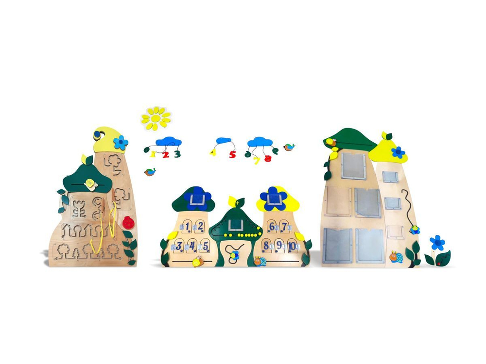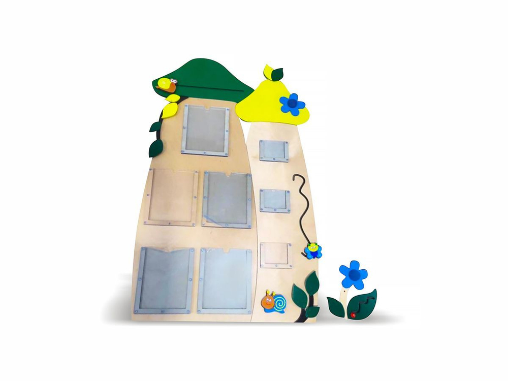 Привлекательный и интересный набор панелей представлен в виде полянки с грибами, в которых живут маленькие обитатели. Улитки, бабочки и божьи коровки могут двигаться по вырезанным дорожкам, не только радуя малышей своим дружелюбным видом, но и помогая развивать моторику и хватательный рефлекс. Набор тактильно-развивающих панелей станет ярким и полезным украшением игровой комнаты в детском саду, развивающем учреждении или дома.