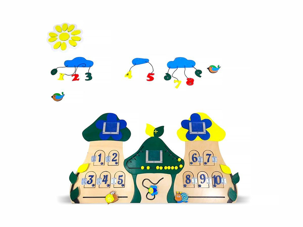На облачках закреплены цифры при помощи веревочек. Дети могут прощупывать каждую цифру и освоить ее написание при помощи тактильных ощущений. Также цифры помогают запомнить последовательность их от 0 до 9 и в обратную сторону.