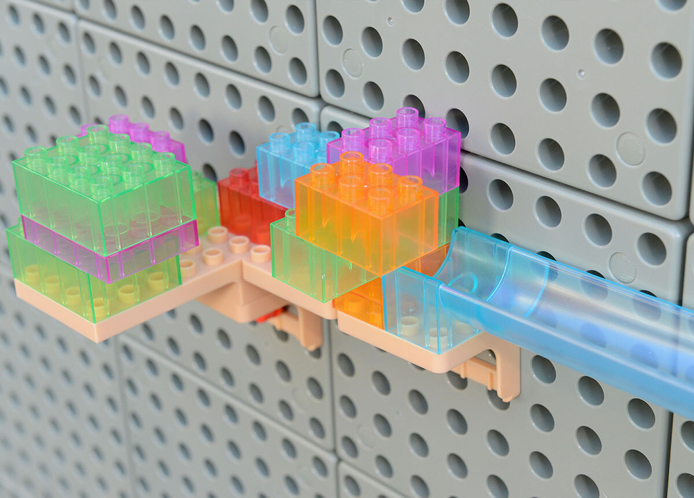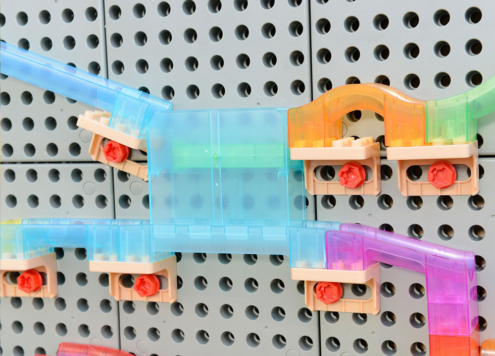 Набор представляет собой игру с шариками, с помощью которой дети могут строить дорожки и спуски, добавлять переключатели направления и другие механизмы движения. Закрепляется на STEM Стене.