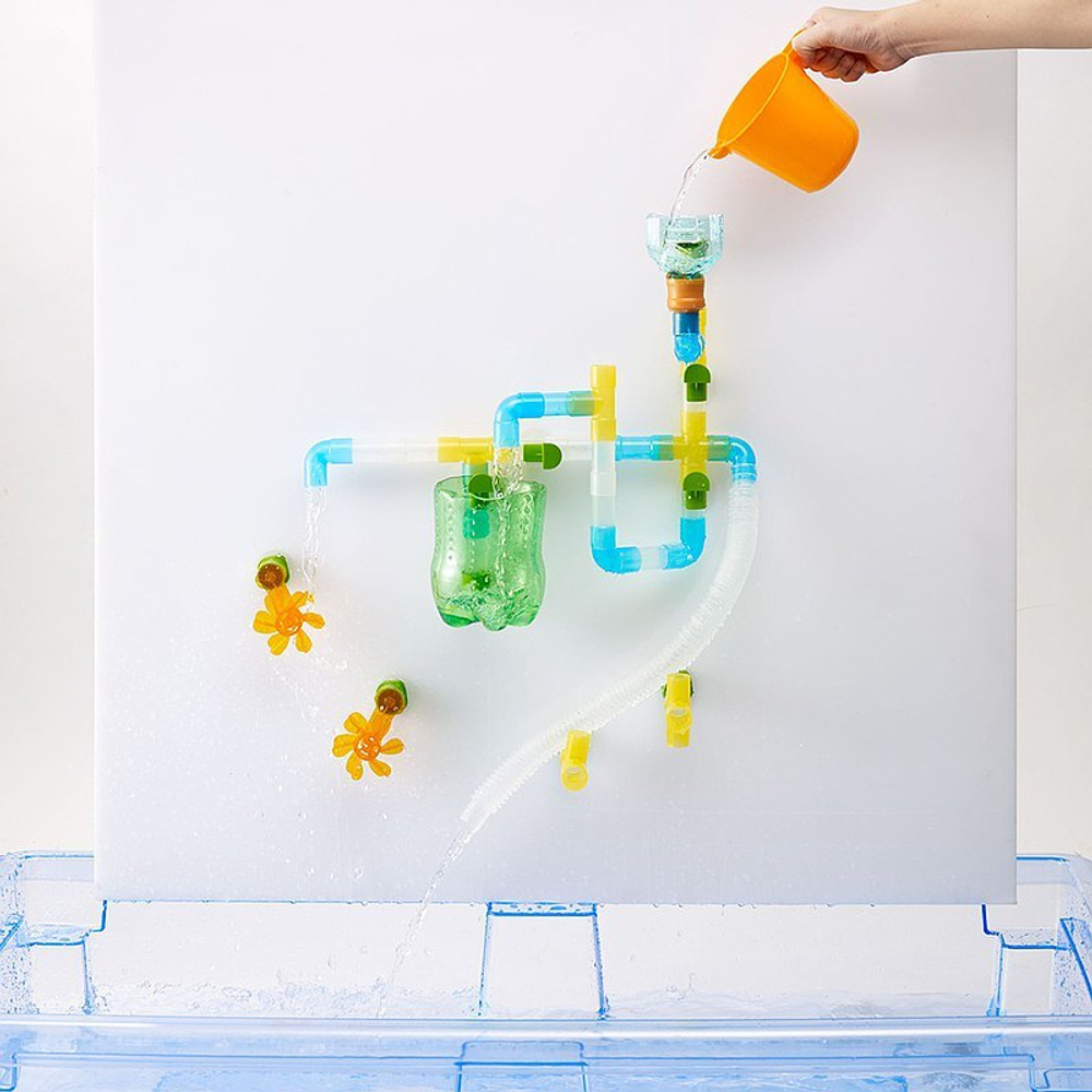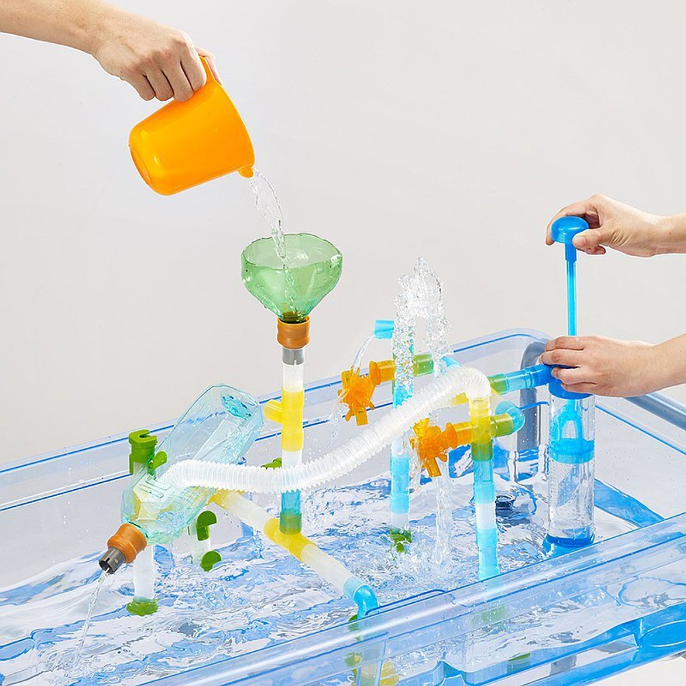 Дети могут сконструировать собственную систему водоснабжения, смогут наливать и перекачивать воду, одновременно развивая важные двигательные навыки и изучая измерение, счет, экспериментирование, творчество, социальные навыки, командную работу и наблюдение посредством интересных и веселых занятий с водой.