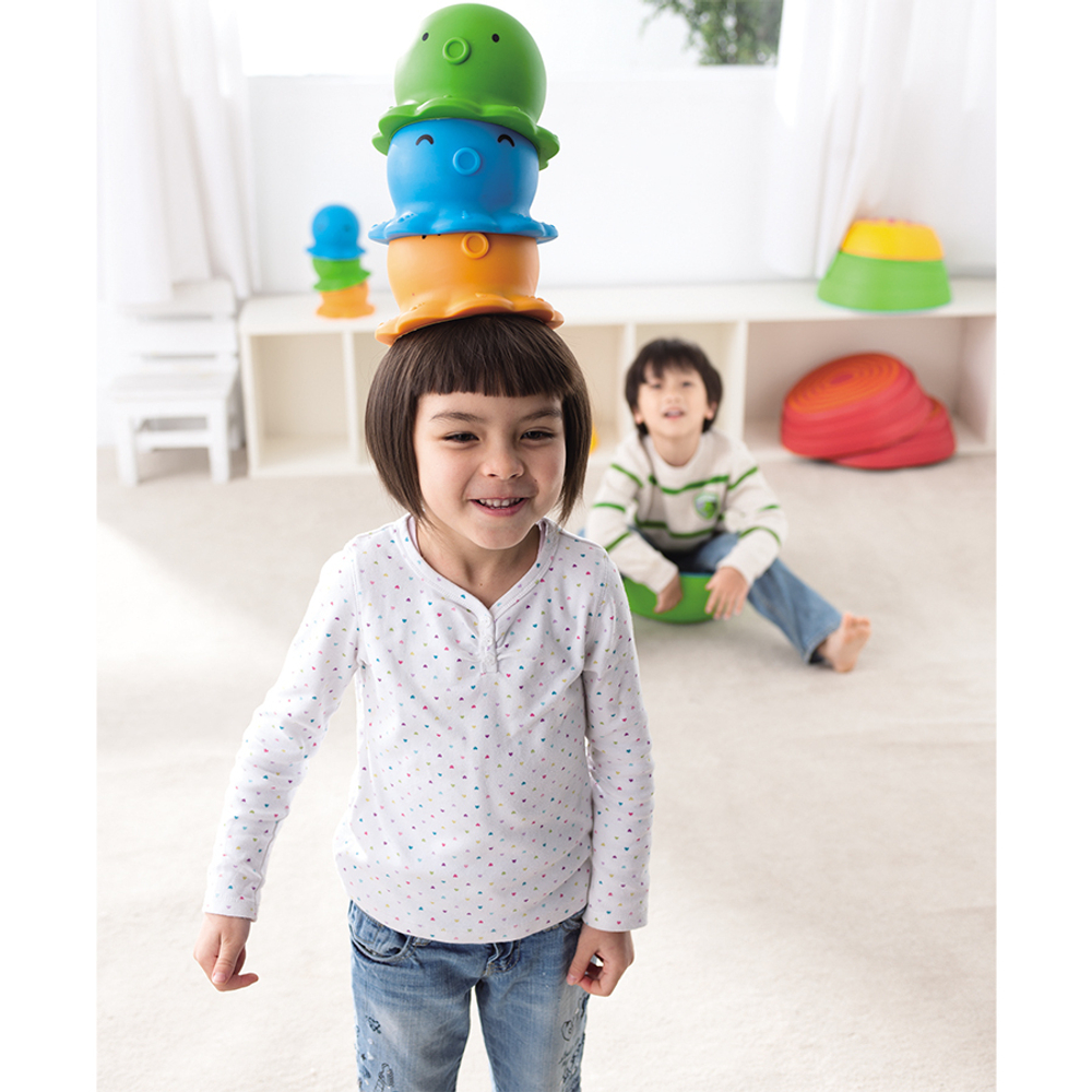 В комплекте не менее трех элементов в виде медуз зеленого, синего и оранжевого цветов. Для упражнений на балансировку медузу помещают на голову ребенка, для усложнения задания на ней размещаются все три элемента набора. Способствует формированию правильной осанки, навыков балансировки.