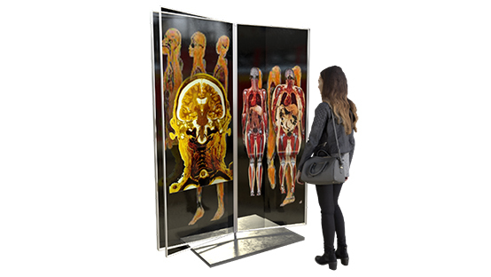 Стенд позволяет провести изучение анатомии на основе срезов человеческого тела с интервалом в 6 мм. Данный стенд-модель может быть выполнен в трех вариантах, по виду проекции: Аксиальная, Сагиттальная, Латеральная. Количество срезов и их толщина могут быть изменены по желанию заказчика. Также комплекс содержит блок интерактивного сопровождения и озвучки каждого среза с возможностью ее изменения. При переключении среза «перелистывании» прозрачной панели происходит активация следующего нарративного блока с озвучкой на основе представленного среза.