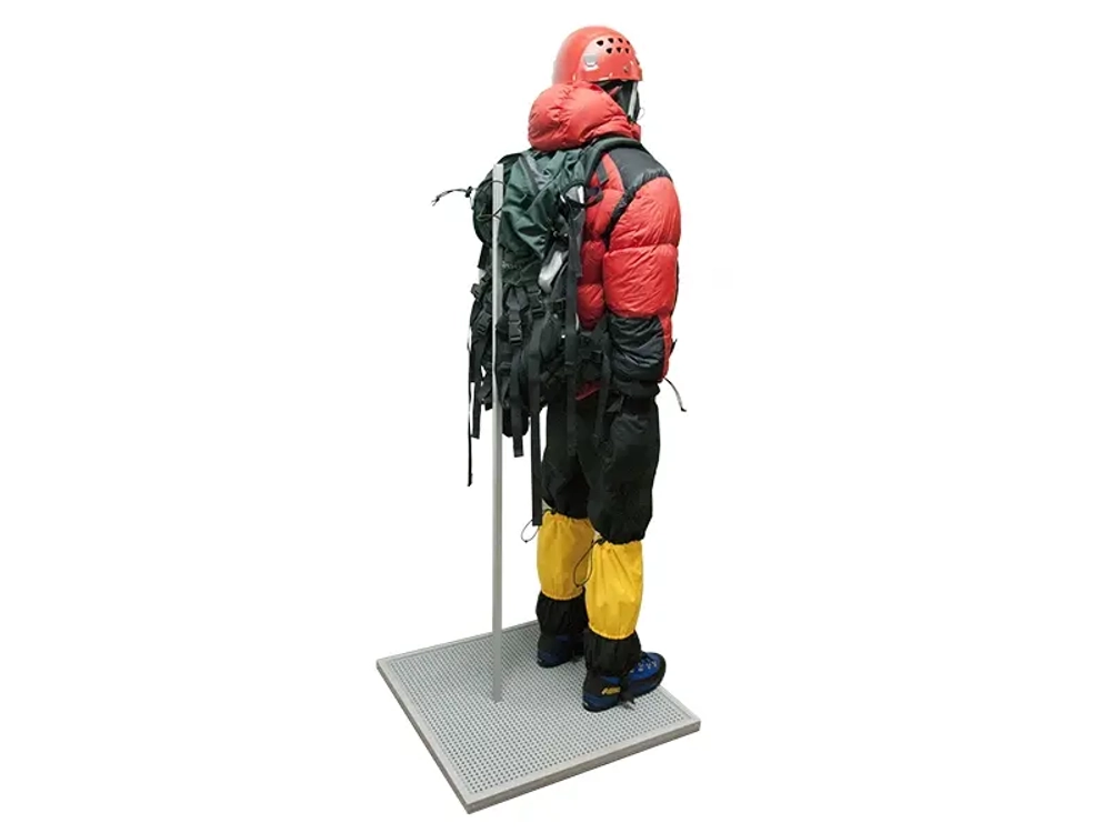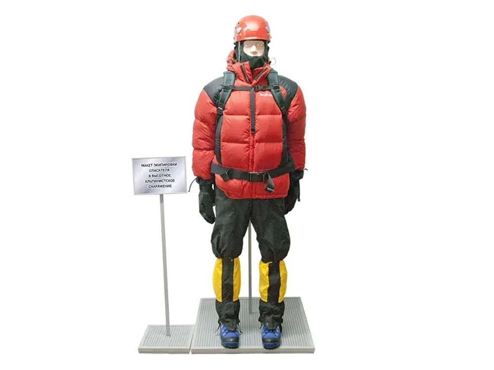 Наглядный макет экипировки спасателя "Зимняя одежда и высотный альпинизм" представляет собой стоячий манекен, экипированный в высотное альпинистское снаряжение: