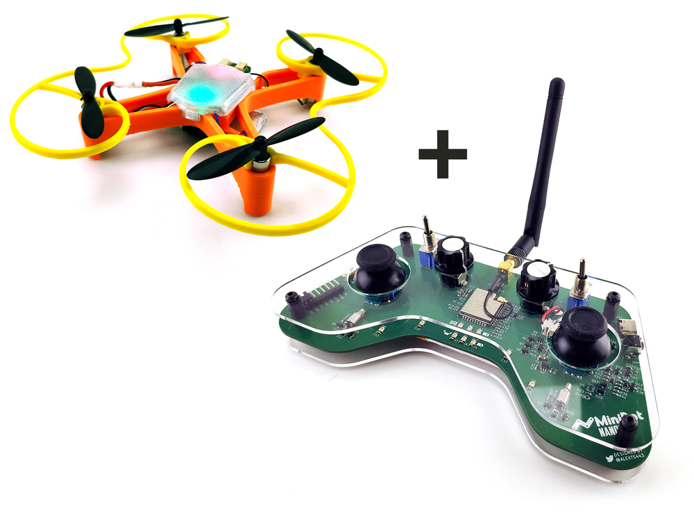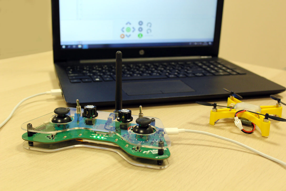 Комплект из образовательного набора квадрокоптера Nanopix и пульта управления Nanopad. Для управления дроном можно использовать смартфон/планшет, либо ПК, но управление с пульта Nanopad более удобное и интерактивное.